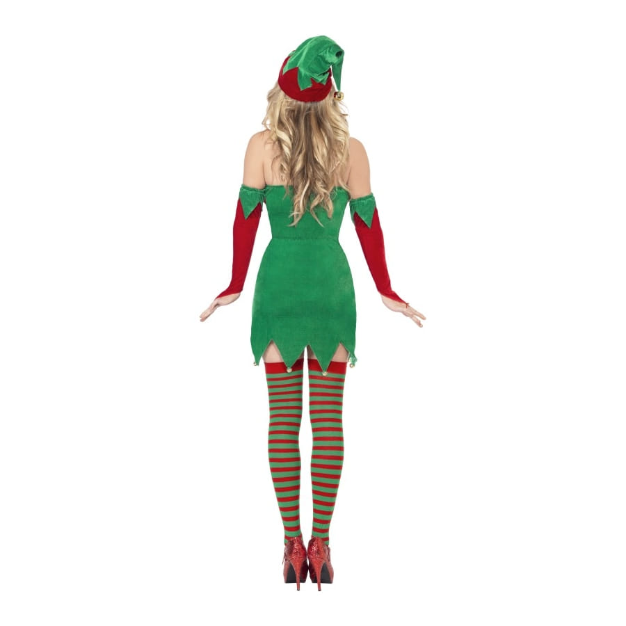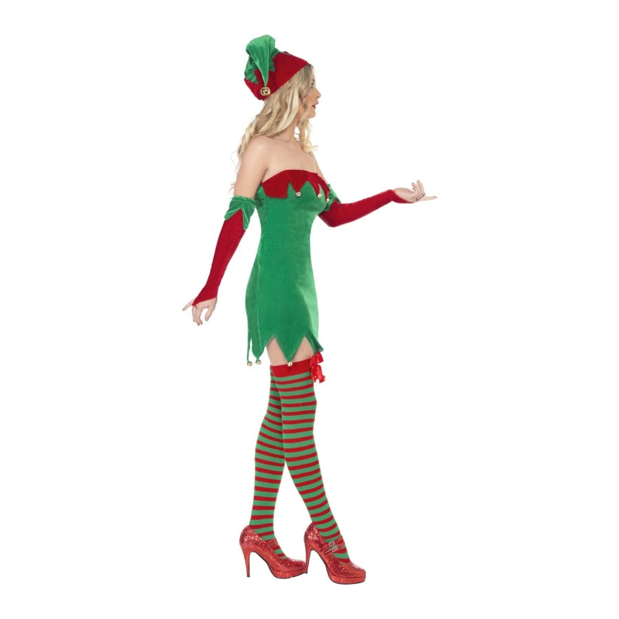 Déguisement d'elfe, pour femme, composé d'une robe rouge, d'un chapeau et de gants de couleur rouge et verte. Le chapeau est également orné d'un petit grelot doré. Vous aurez la possibilité de choisir entre une taille S, M ou L au moment de votre commande. Cette robe moulante et courte fera de vous un elfe sexy!
