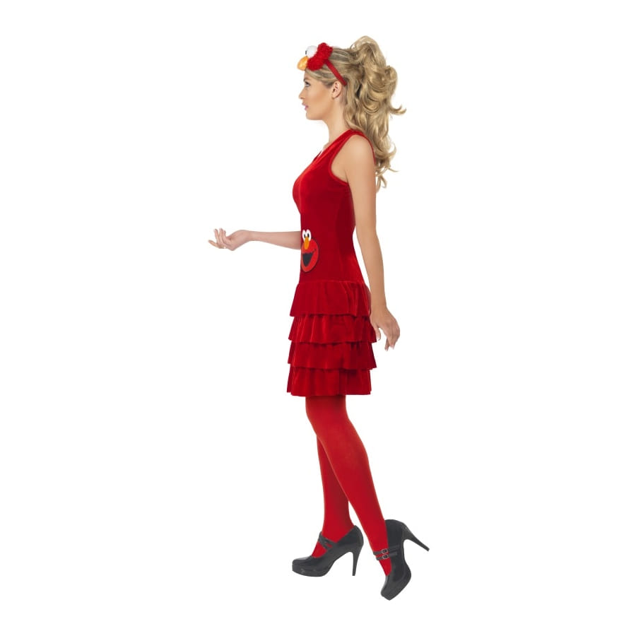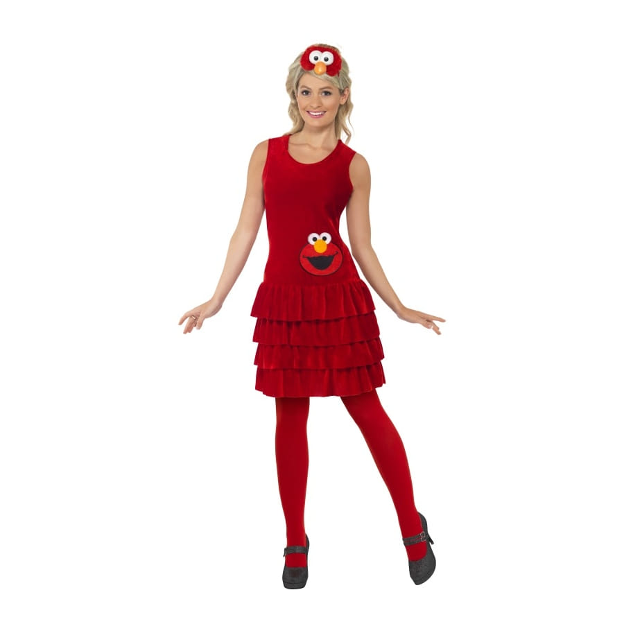 Déguisement d'Elmo de couleur rouge, pour femme, composé d'une robe à froufrou avec imprimé Elmo et d'un chapeau assorti. La robe est disponible en taille S, M ou L. Servez-vous-en pour créer une atmosphère drôle et enfantine pour un anniversaire ou pour un déguisement de Muppets.