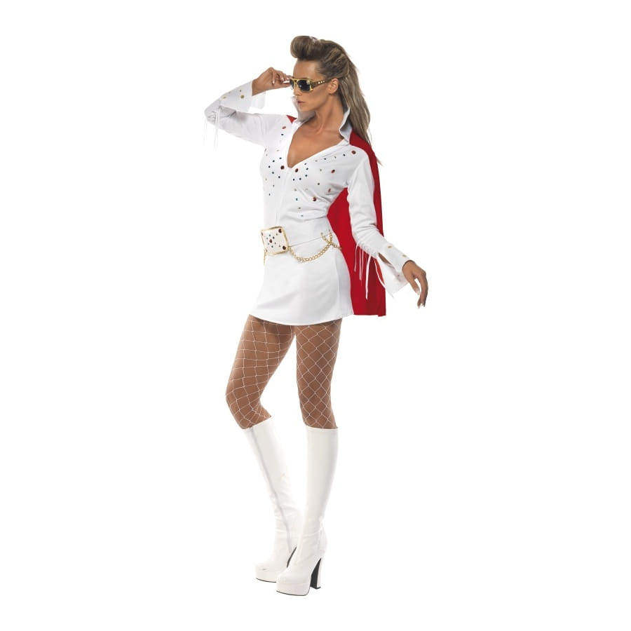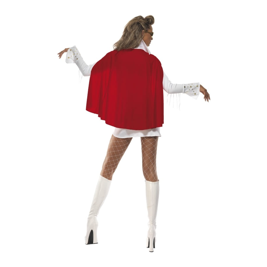 Déguisement d'Elvis, pour femme, composé d'une robe et d'une cape. La robe est entièrement blanche tandis que la cape est rouge. L'ensemble est disponible en taille S, M ou L. Ce déguisement pourra vous servir pour une soirée Rock'n Roll, pour une soirée sexy ou pour une fête basée sur la musique.