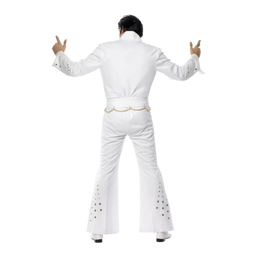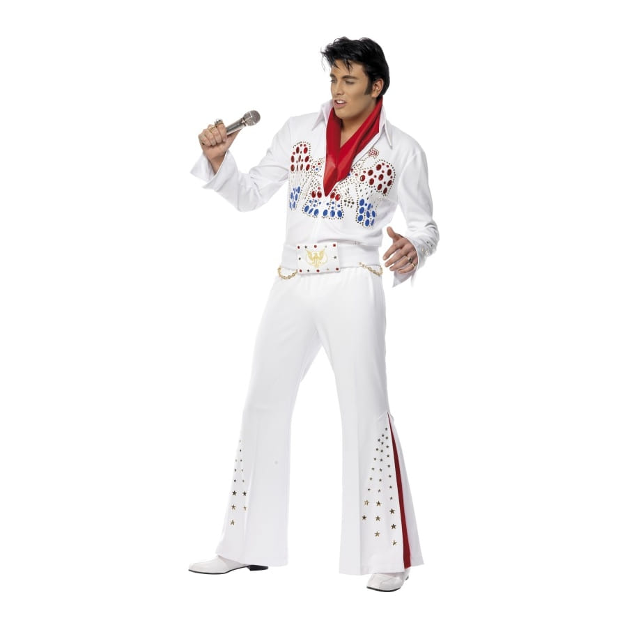 Vous serez le king de la fête avec ce costume de Elvis Presley. Ce costume est composé d'une combinaison de couleur blanc manche longue avec des motifs dessus. Il est aussi composé d'une ceinture blanche ainsi que d'un foulard rouge.