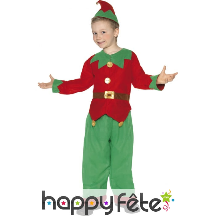 Un déguisement de aide père noël pour votre enfant, il sera heureux de porter ce costume pour la noël ou pour une occasion spéciale. Il est composé d'un chapeau avec cloche de couleur vert et rouge, d'une tunique vert et rouge. D'un pantalon vert et rouge ainsi que d'une ceinture marron et une boucle dorée.