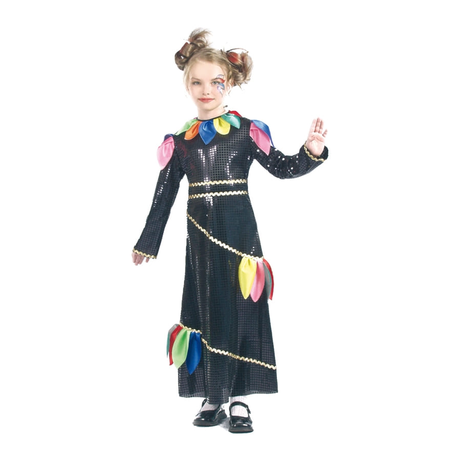 Si pour un déguisement vous voulez une tenue disco pour votre fillette, celle-ci est la bonne. Jolie robe à paillettes, de couleur noire, avec une ceinture, le tout orné de petites feuilles multicolores sur le bas de la robe, autour du cou et sur les épaules. Rajoutez-lui une coiffure des années 70 ou 80 et un maquillage léger pour faire plus vrai. La robe est proposée en taille 116/128/140/152.