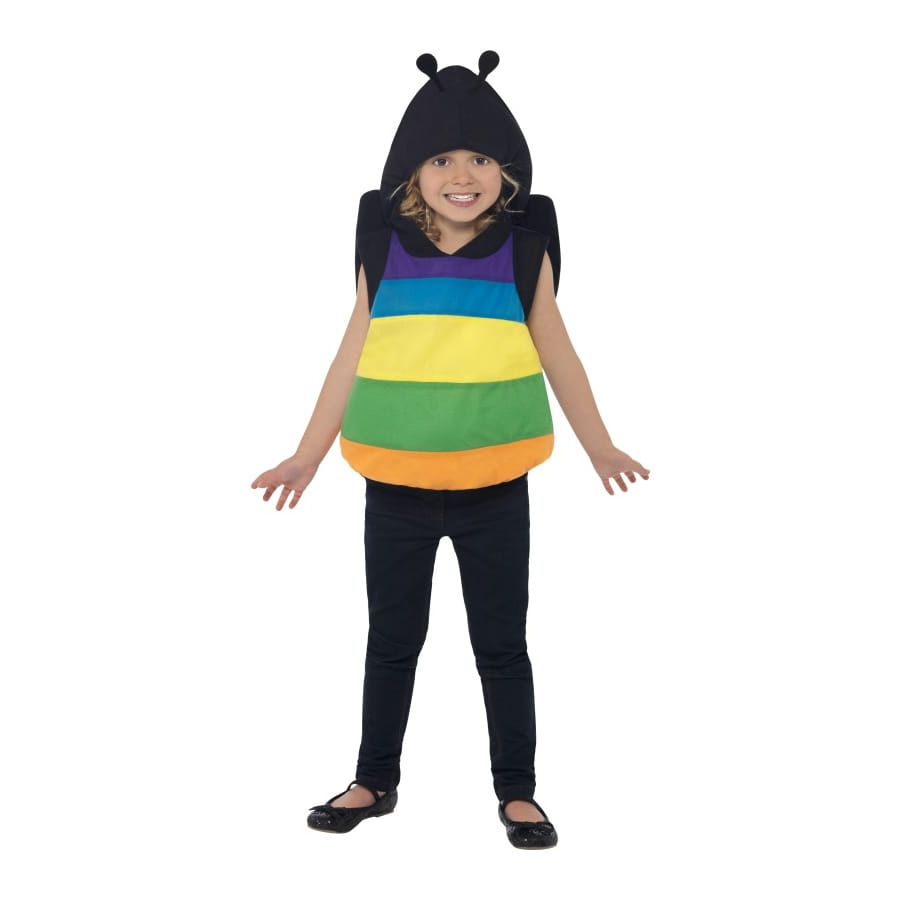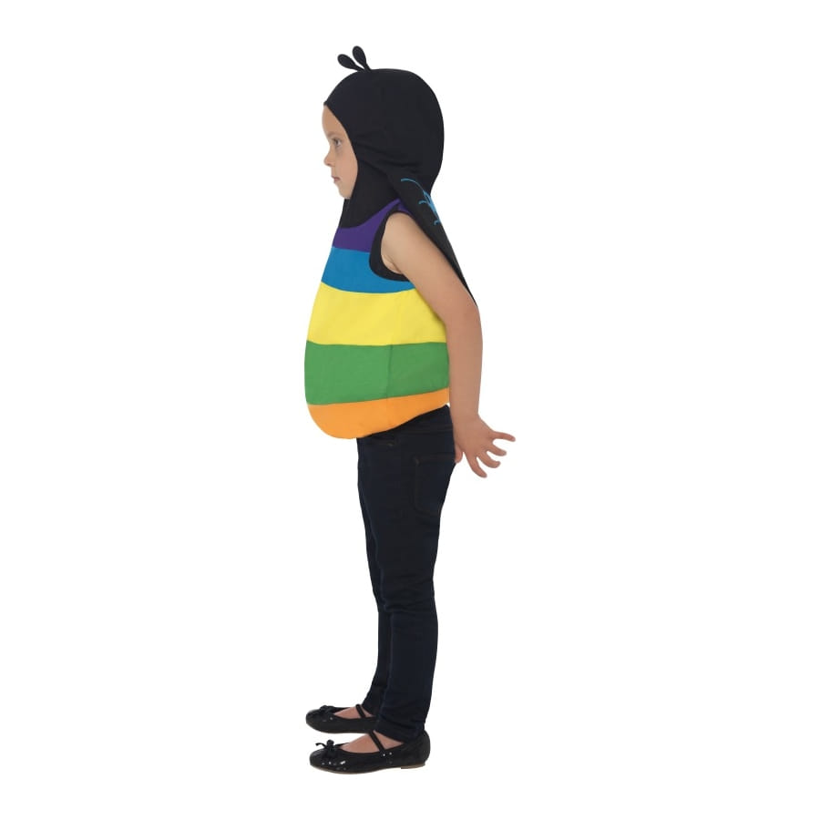 Déguisement de papillon, pour garçon ou fille, de couleur noire, avec rayures violettes, bleues, jaunes, vertes et orange. Cet ensemble est disponible en taille S ou T2. C'est un déguisement simple mais adorable qui ira très bien à votre enfant pour un anniversaire.