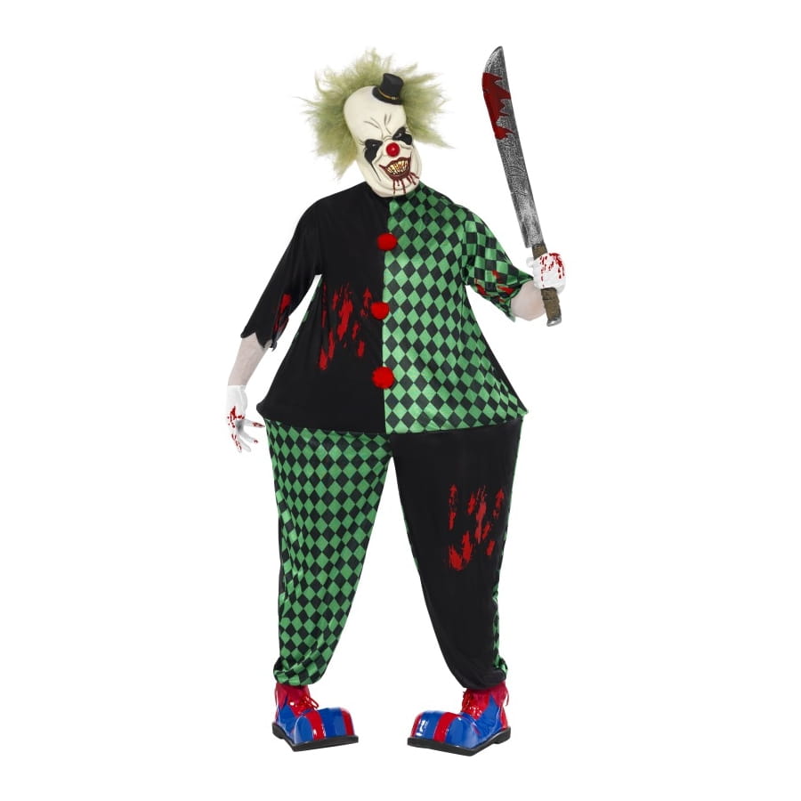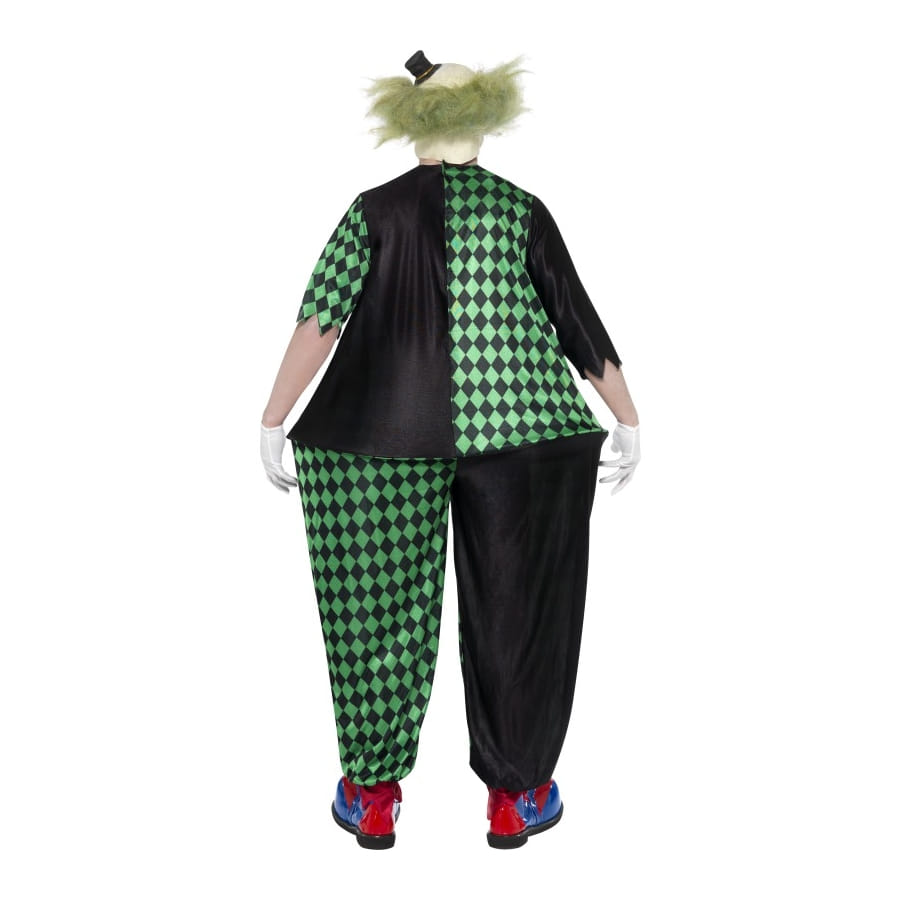 Ce déguisement d’énorme Clown de taille L est un costume moitié noir, moitié vert et noir. Avec des taches rouges dessus et des boutons rouges. Il est aussi composé d'un masque blanc avec un air effrayant et des cheveux vert. Vous pourrez porter ce déguisement qui est plus large au centre pour Halloween ou une soirée horreur.