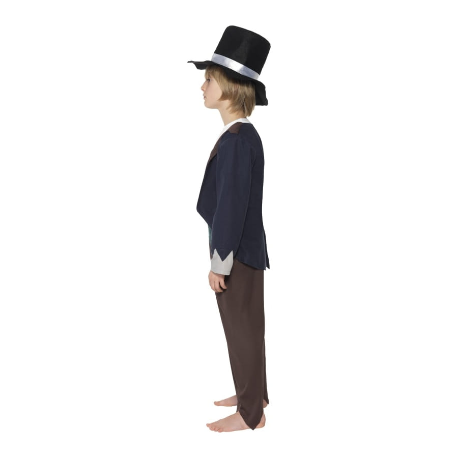 Déguisement de garçon pauvre de l'époque victorienne composé d'un top, d'un pantalon et d'un chapeau. Le top est de couleur verte, blanche et marron, le pantalon est marron et le chapeau est noir et blanc. Le tout est disponible en taille S, M ou L. Ceci sera très utile pour un spectacle d'école.