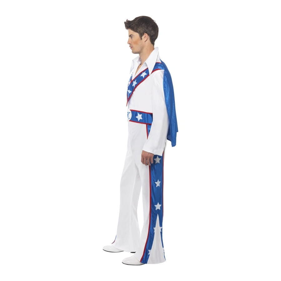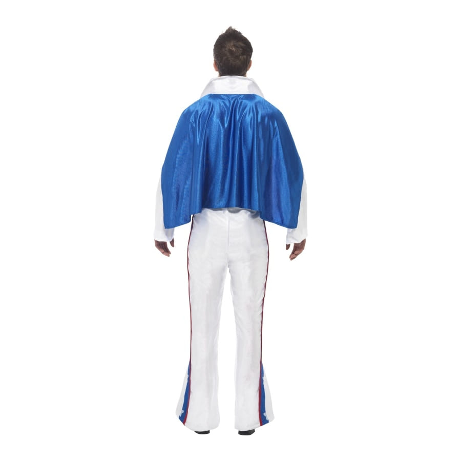Déguisement d'Evel Knievel, pour homme, composé d'une combinaison blanche, rouge et bleue et d'une cape bleue. La combinaison est imprimée d'étoiles blanches et comporte un grand col. Elle est disponible en taille S, M ou L. Vous sera la star de la soirée avec ce déguisement.