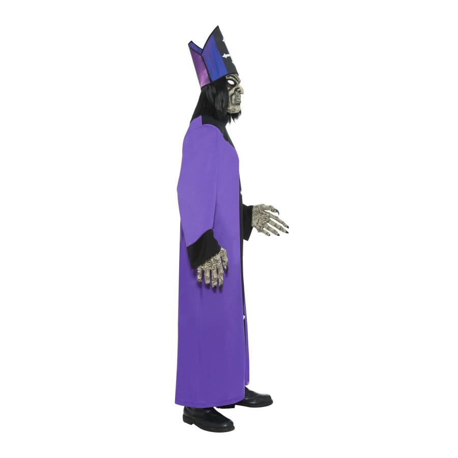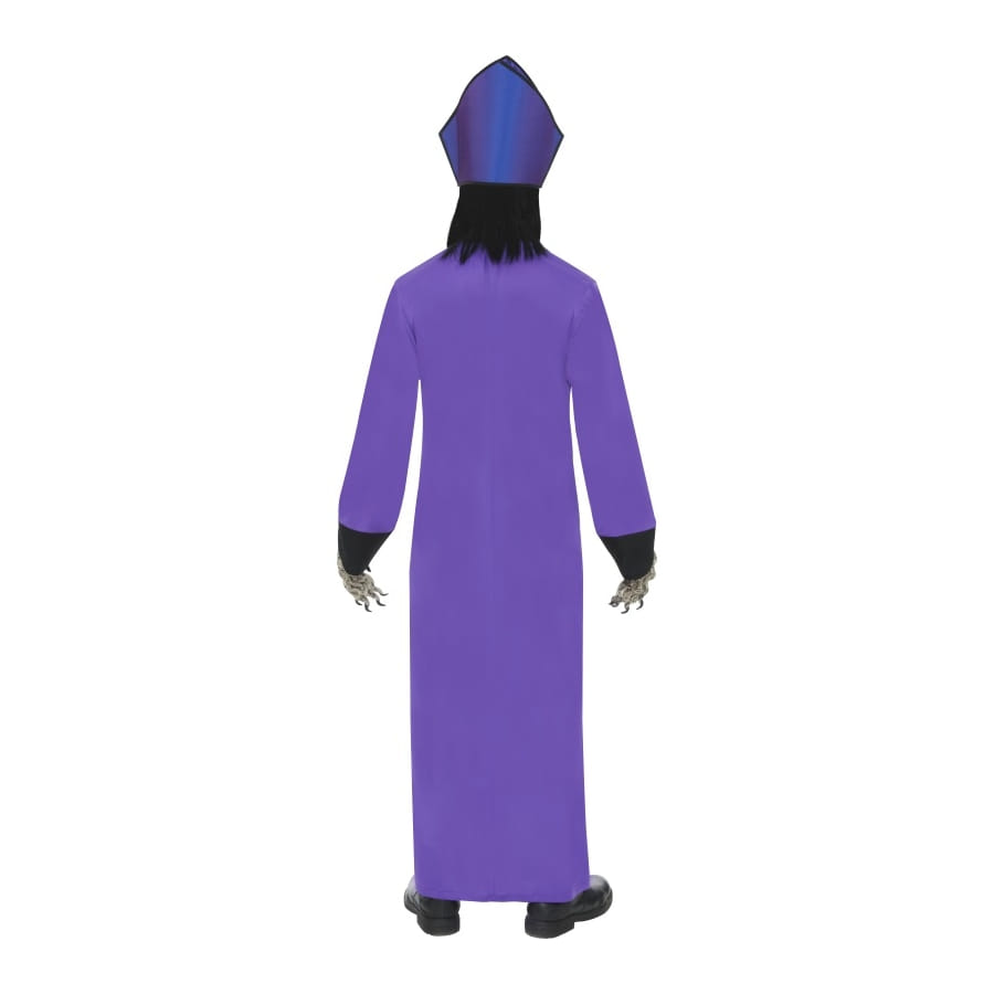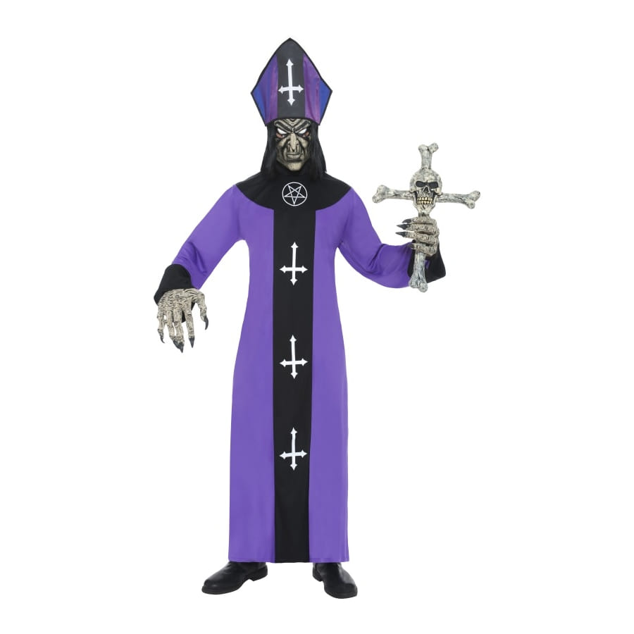 Ce costume d'évêque fou vous pourrez le porter pour le carnaval ou encore pour halloween. Il est composé d'une robe manche longue de couleur mauve et noir avec des croix renversé sur le centre. IL est aussi composé d'un masque en latex de couleur gris ainsi que des mains grises avec des ongles longs. Sans oublier un chapeau mauve et noir avec une croix renversé dessus ainsi que des cheveux.