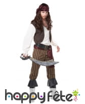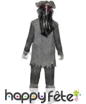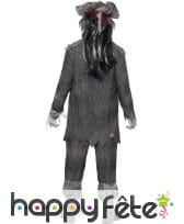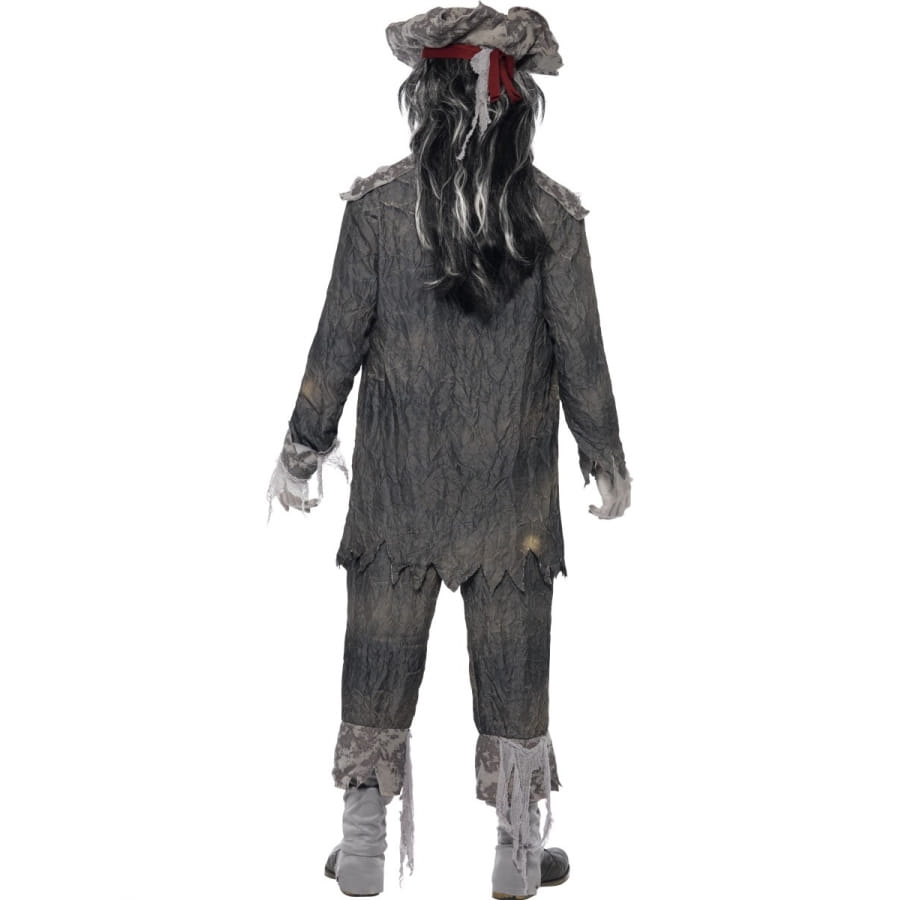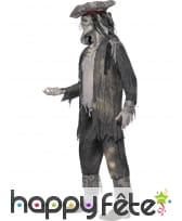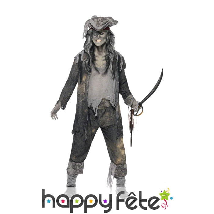 Costume de pirate fantôme, pour homme ou femme, composé d'une veste, d'un pantalon et d'un chapeau, tous trois de couleur grise. Les vêtements sont en forme de guenilles, ce qui accentue parfaitement l'aspect mort-vivant de votre personnage. L'ensemble est disponible en taille M, L ou XL.