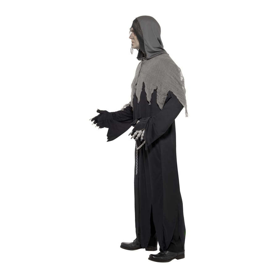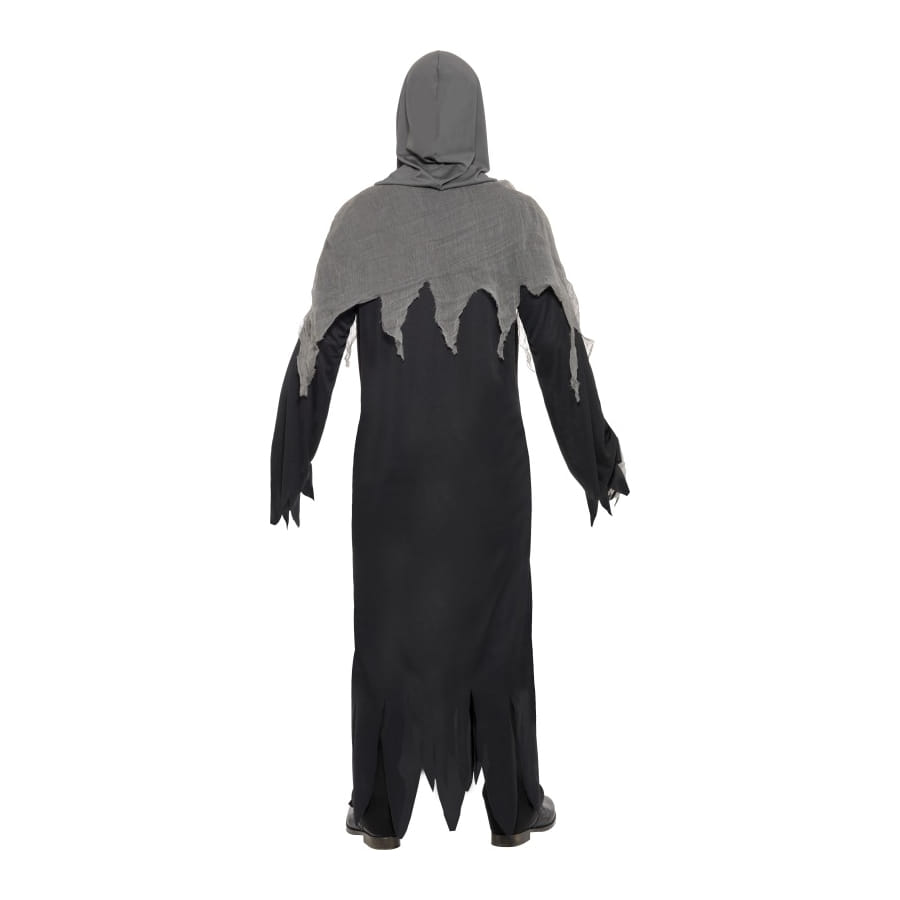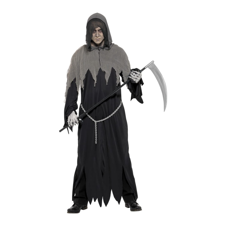 Déguisement de faucheuse, pour homme, composé d'une robe grise et noire, d'une chaîne en guise de ceinture et d'un capuchon gris. Le tout vous donnera un air sombre et lugubre, idéal pour jouer le rôle de la Mort en errant sur les rues lors de la nuit d'Halloween.