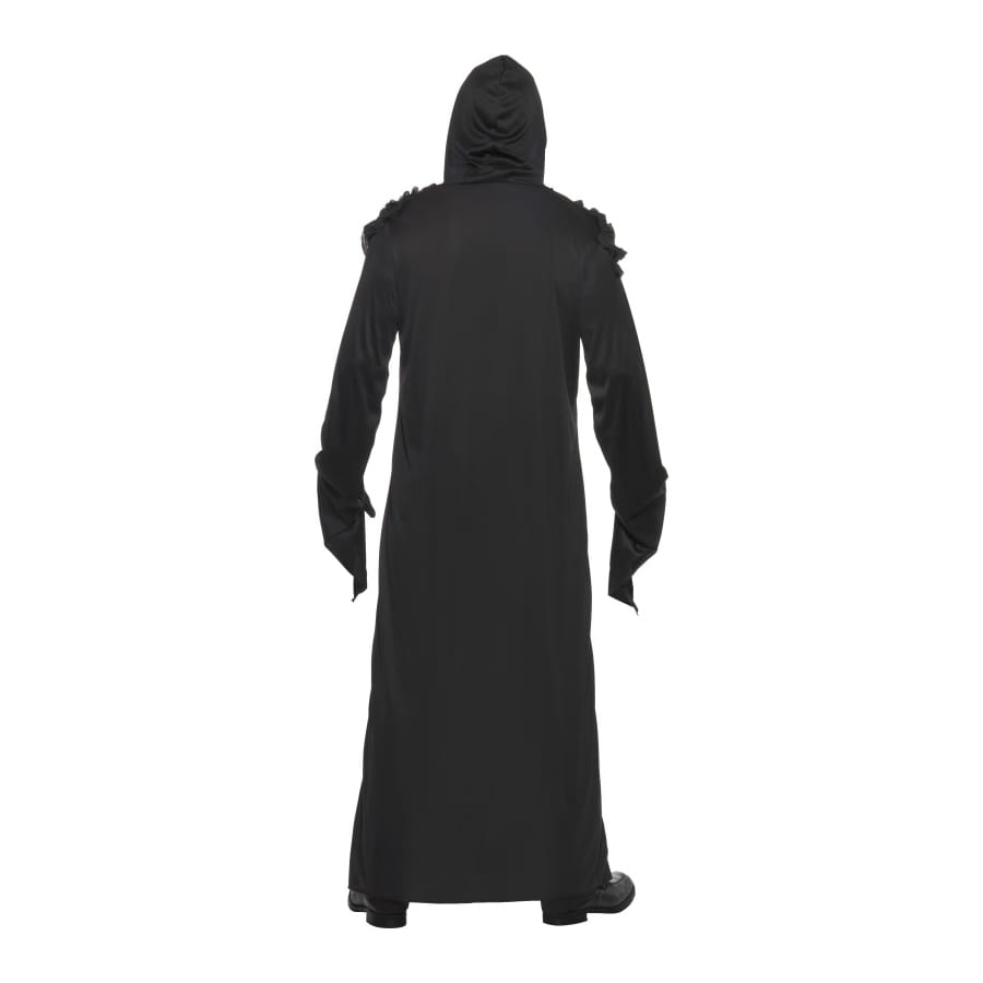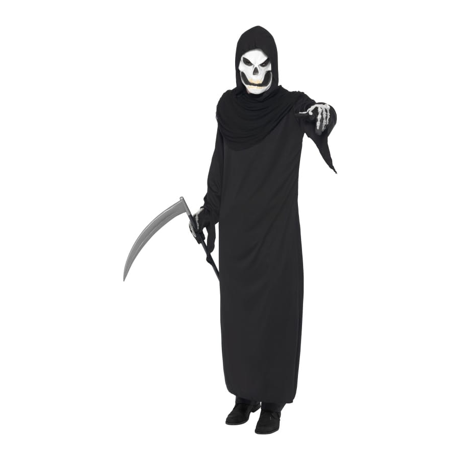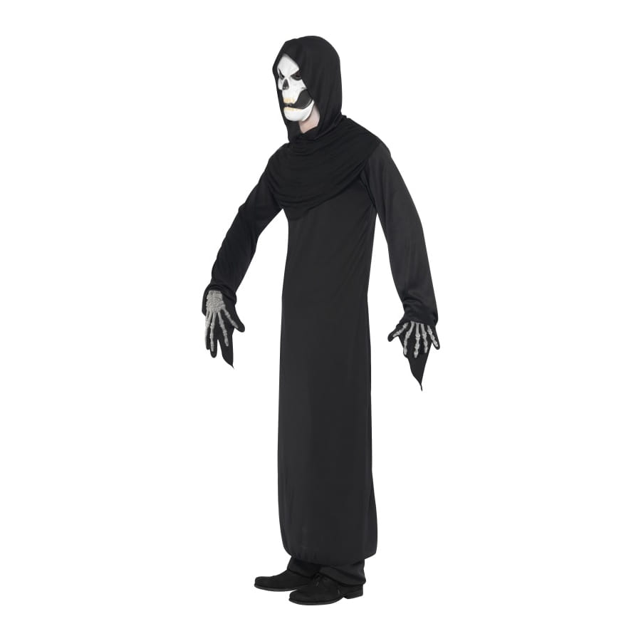 Déguisement de Faucheuse, pour homme, composé d'une longue robe noire et d'un masque de squelette blanc et noir. Allez récolter les âmes lors de la nuit d'Halloween!
