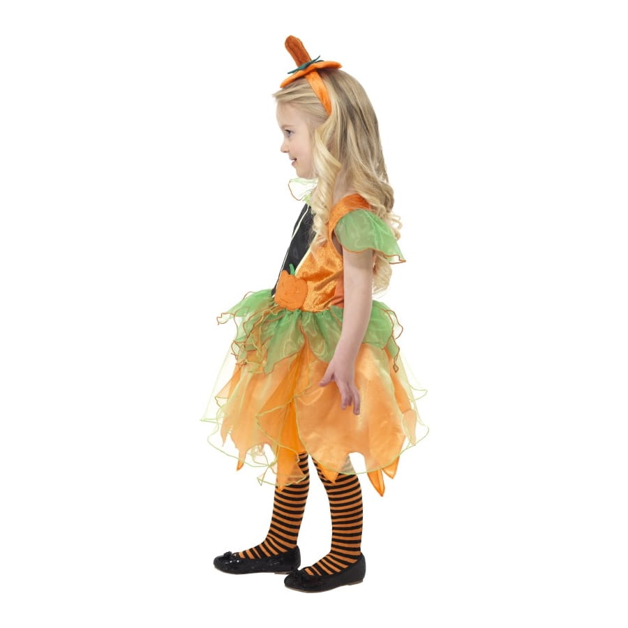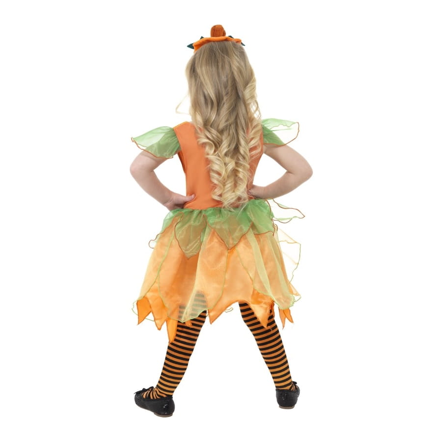 Déguisement de fée citrouille, pour enfant, composé d'une robe et d'un serre-tête. Le serre-tête est en forme de citrouille orange et vert. La robe est composée de plusieurs couche de tulles orange et vertes et de quelques touches de noir. L'ensemble convient surtout aux enfants de 3 à 4 ans. Il donnera à votre enfant un aspect de fée botanique.