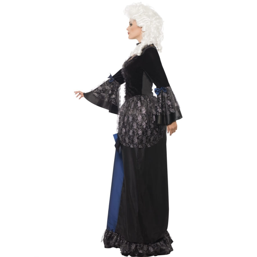 Déguisement victorien, pour femme, composé d'une sublime robe noire et bleue. Les manches sont évasées et ornées de dentelles noires, assorties au jupon, avec des noeuds bleu nuit et des volants. Cette robe est disponible en taille S, M ou L. Elle fera de vous une Grande Dame ou une marquise de la Belle Epoque.