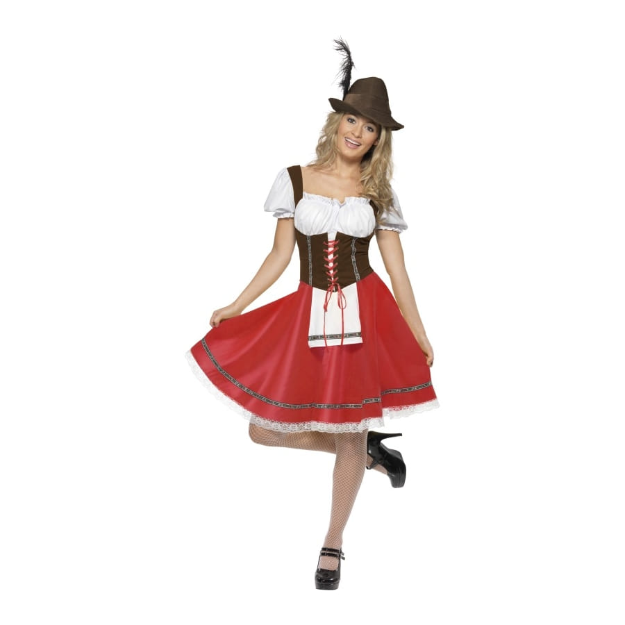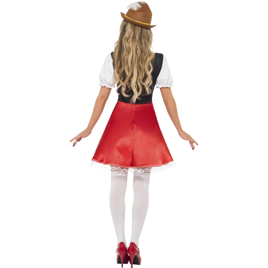 Déguisement de Bavaroise, pour femme, composé d'une robe et d'un tablier disponibles en taille S, M ou L. La robe est en forme de corset marron et blanc avec lacets rouges et une jupe rouge avec tablier et dessous blancs. Il n'y a pas de meilleur moyen de célébrer la bière qu'en Bavaroise!