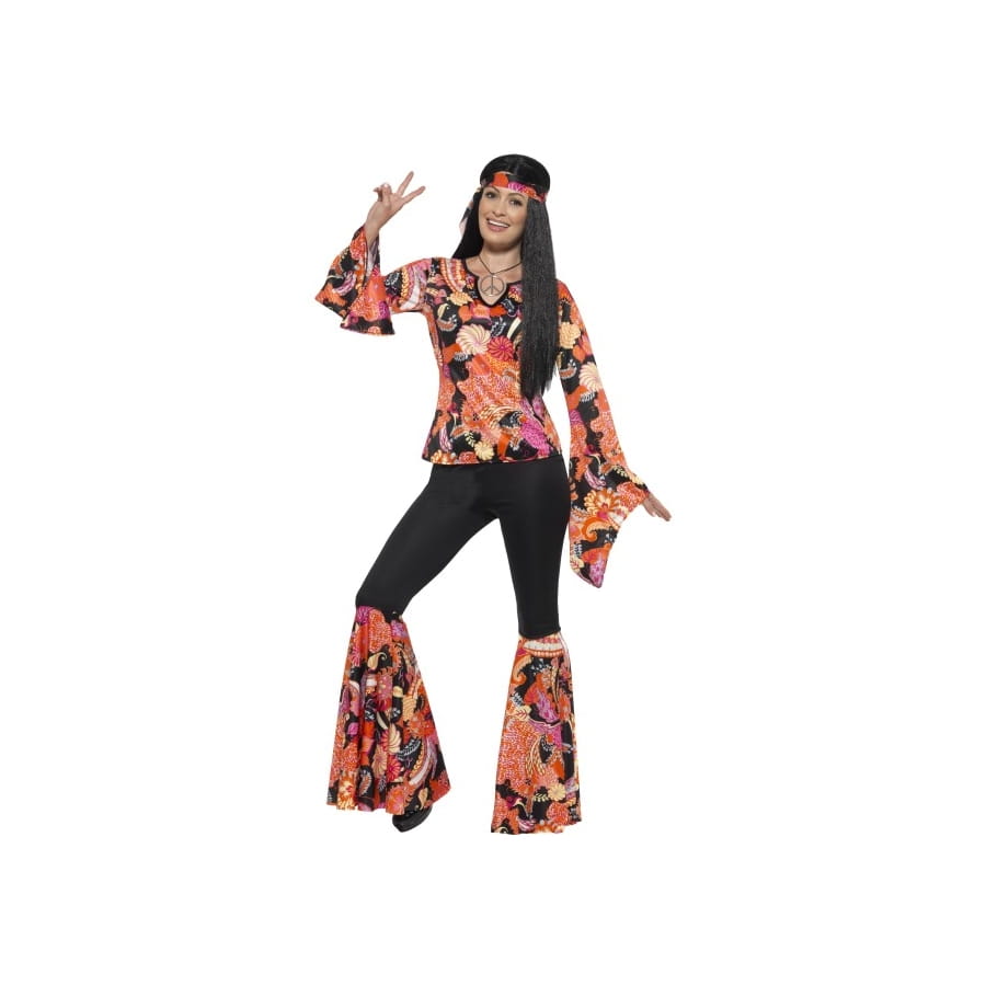 Le style hippie est très simple à incarner. Enfilez ce déguisement femme hippie imprimé fleuri orangé tout en couleur et souriez à tout le monde car vous êtes un symbole de paix et d'amour. Le haut de ce déguisement est fait avec des motifs avec de grosses fleurs très colorés mais dominé par la couleur orange. Ses manches sont amples vers le bas pour un confort optimal. Le pantalon est de couleur noire, dont les pattes d'éléphant sont faites avec le même tissu que le haut du déguisement. Il y a également le bandeau du même tissu et un médaillon, symbole de la paix, que vous mettrez autour du cou.