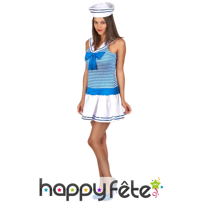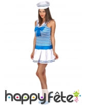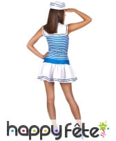 Alors, qu'avons-nous dans ce sac d'équipage ? Tout d'abord, une robe, et pas n'importe laquelle. Cintrée au niveau du buste, elle mettra en valeur votre silhouette avec grâce. Vous craquerez pour ses manches courtes et sa partie basse légèrement bouffante, parfaite pour esquisser quelques pas de danse. Et que serait un déguisement de marin sans ses rayures bleues et blanches ? Typiquement maritime, son col, ses sequins bleus brillants et ce petit noeud au décolleté ajoutent une touche chic et glamour.