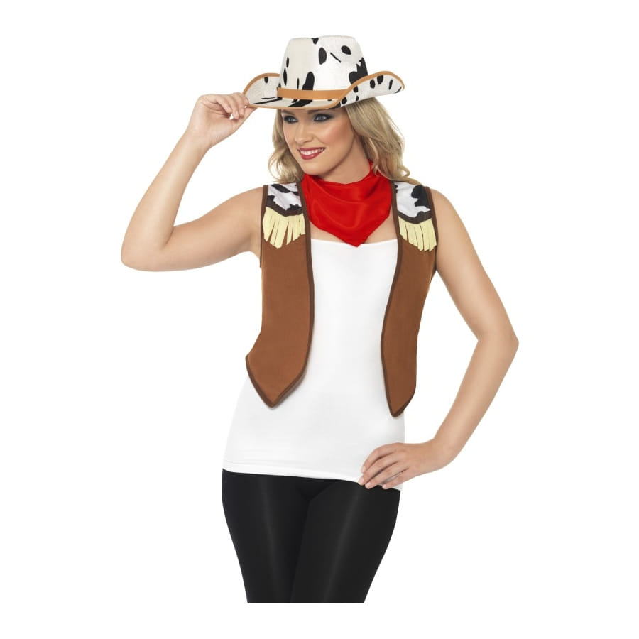 Ce déguisement est composé d'un veston de couleur marron avec des franges beige dessus, d'un foulard rouge, d'un chapeau de couleur blanc avec des taches de noires et la bordure marron. Ce déguisement de cowgirl est parfait pour un thème sur l'ouest sauvage.
