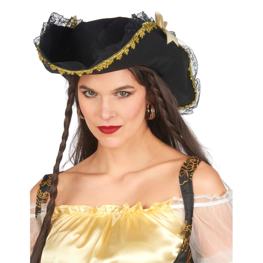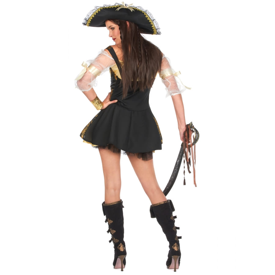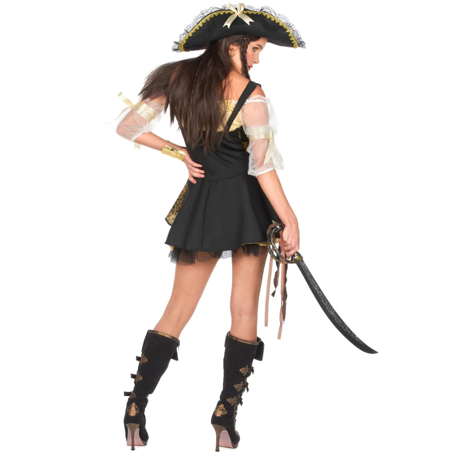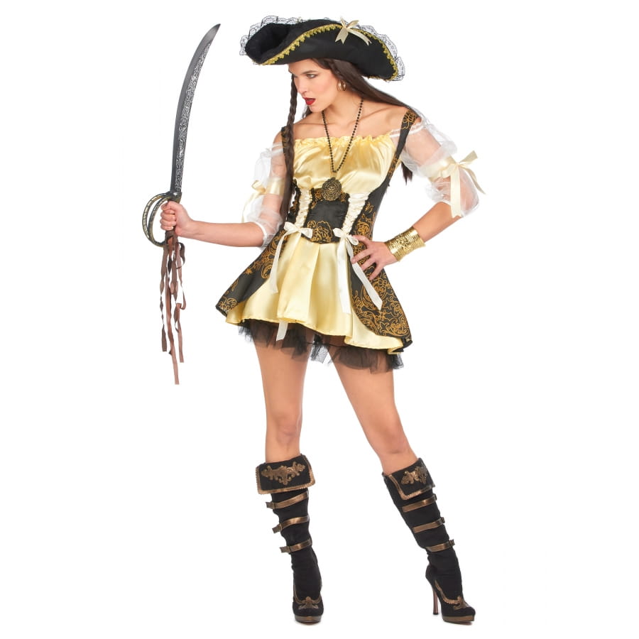 Un costume de pirate réussi repose sur les détails qui le composent. Mesdames, si l'idée d'enfiler une telle tenue vous tente, à l'occasion de la fête des morts, nous avons l'article qu'il vous faut. En effet, nous vous proposons le déguisement femme pirate doré satiné. Il reste disponible sur notre site. Ce produit se compose d'une robe courte fait de tissu satiné jaune. Un jupon sous la jupe lui donne du volume. Ses manches longues en voile blanc sont décorées de rubans jaunes. Un corset noir, pourvue de motifs dorés et à laçage jaune, se porte au-dessus de la robe. Un chapeau noir complète la tenue pour un vrai look de femme pirate.