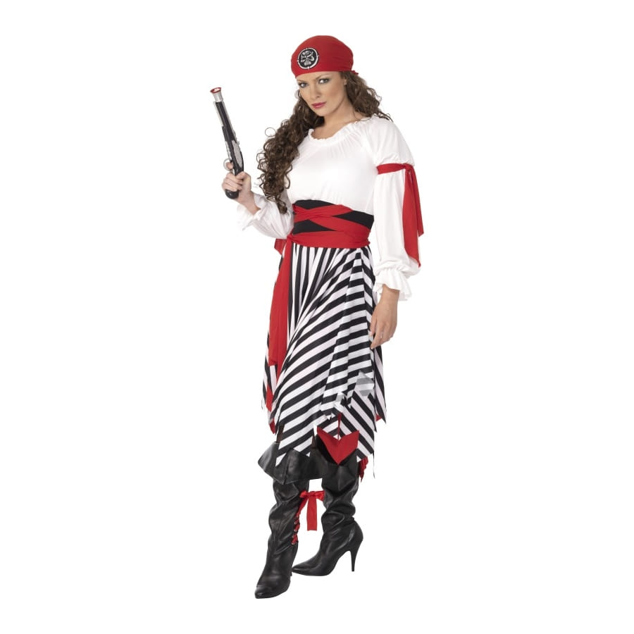 Ce costume de pirate pour femme vous pourrez le mettre a plusieurs reprise. Vous aurez un charme fou dans ce déguisement de pirate. Il est composé d'une robe longue manche de couleur blanche avec une ceinture noire, le bas de la robe est de couleur noir et blanc.