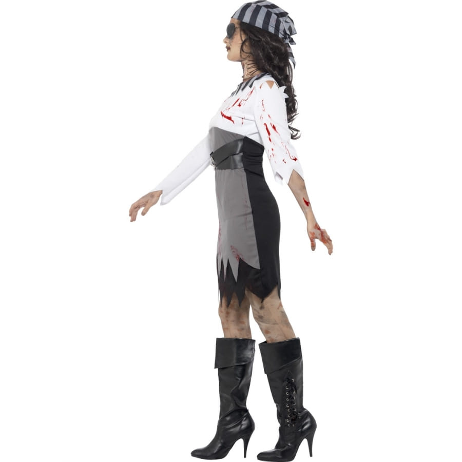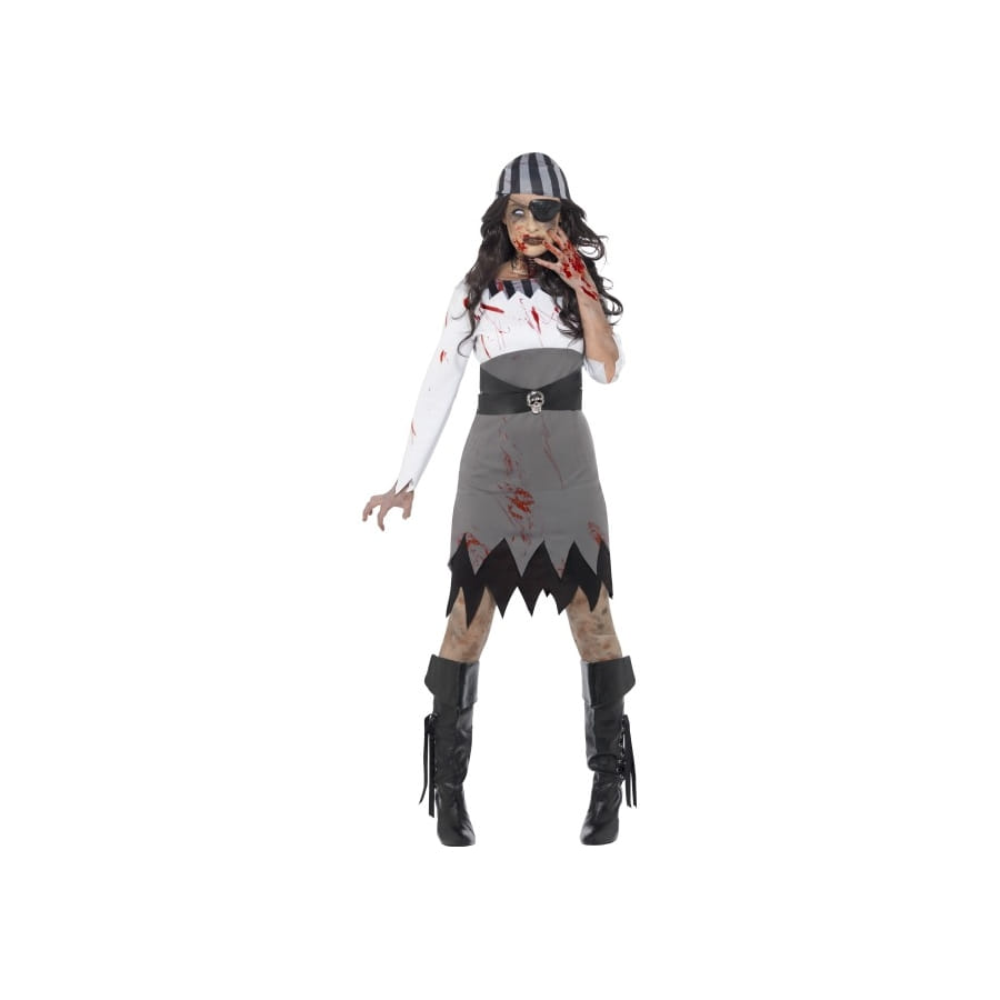 Sensuel, original et terrifiant, ce déguisement femme pirate zombie va vous satisfaire jusque dans les moindres détails ! Celui-ci comprend une robe grise et blanche avec un parfait effet déchiré et ensanglanté. L'extrémité de la robe et celle des manches sont dentelées. L'ensemble est peaufiné par un bandana rayé noir et gris assorti au col de la robe, et un cache-oeil noir pour un effet plus réaliste et plus spectaculaire. Ce déguisement est spécialement consacré à la gente féminine. Que ce soit pour Halloween, une soirée déguisée ou un Zombie Walk..., ce costume sera littéralement indispensable ! N'oubliez pas de parfaire le tout avec quelques taches de sang et du maquillage.