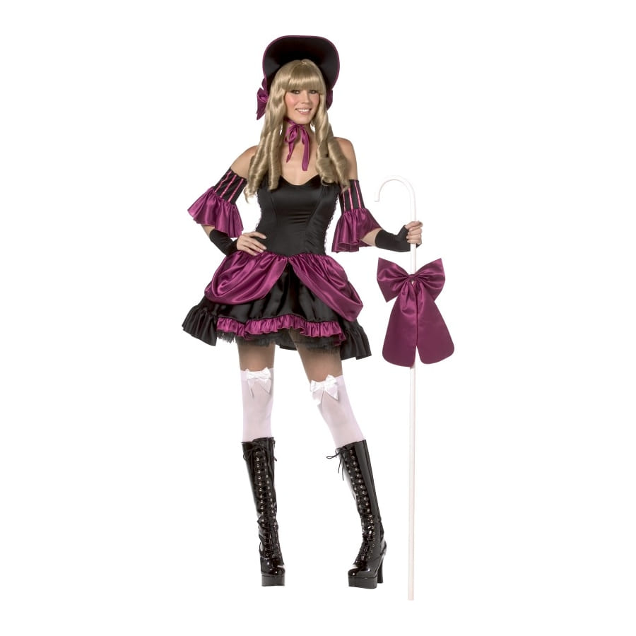 Déguisement de rebelle de couleur noire et mauve, pour femme, composé d'une robe, d'un bâton, d'un chapeau et de manches. La robe est pleine de froufrous assortis aux manches et au chapeau tandis que le bâton est blanc avec un seul et unique et énorme noeud. Vous pouvez choisir entre une taille S, M ou L. C'est une tenue qui vous rendra sexy et audacieuse à la fois!