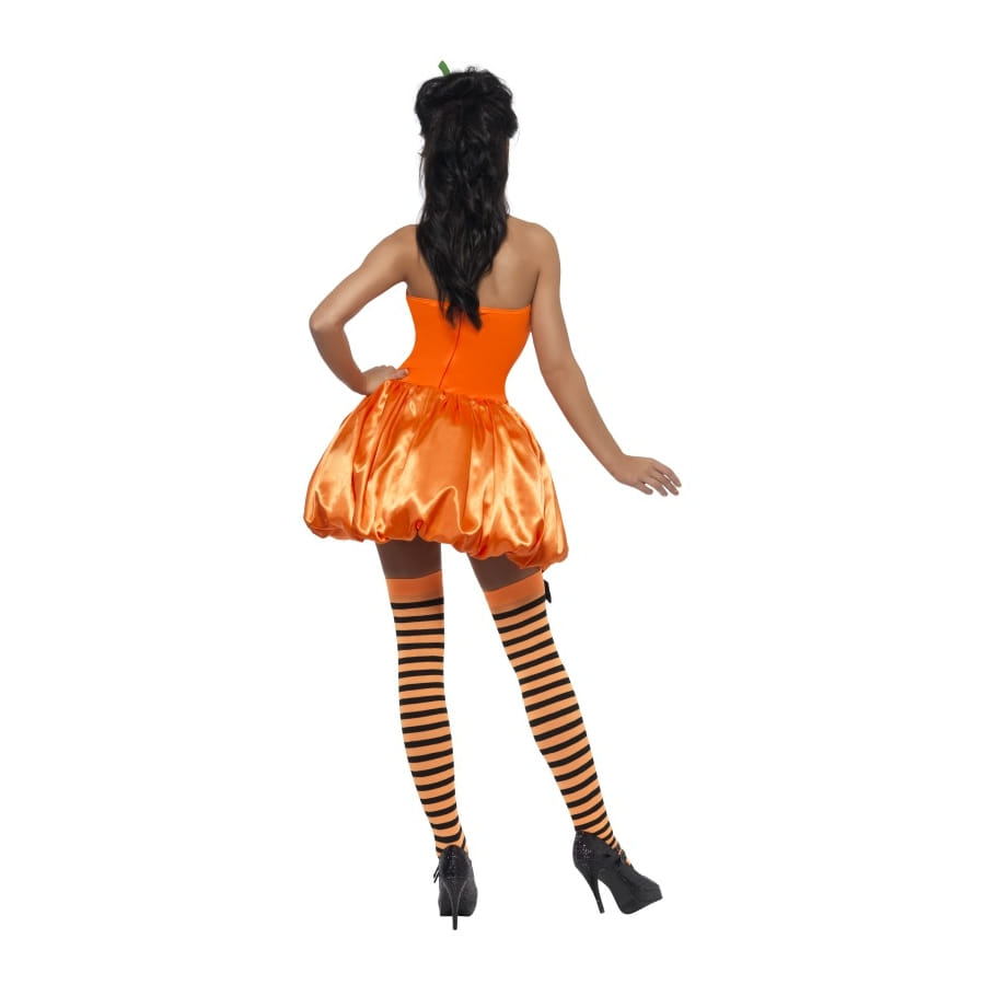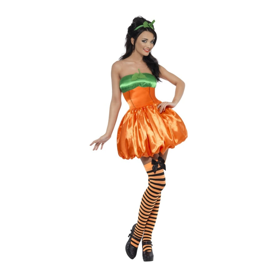 Déguisement de femme citrouille composé d'une robe en satin orange et verte et d'un serre-tête vert. Le jupon de la robe est gonflé, pour un joli effet citrouille. Vous pourrez la commander en taille XS, S, M ou L. Adoptez un look mignon et sage pour Halloween!