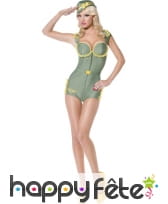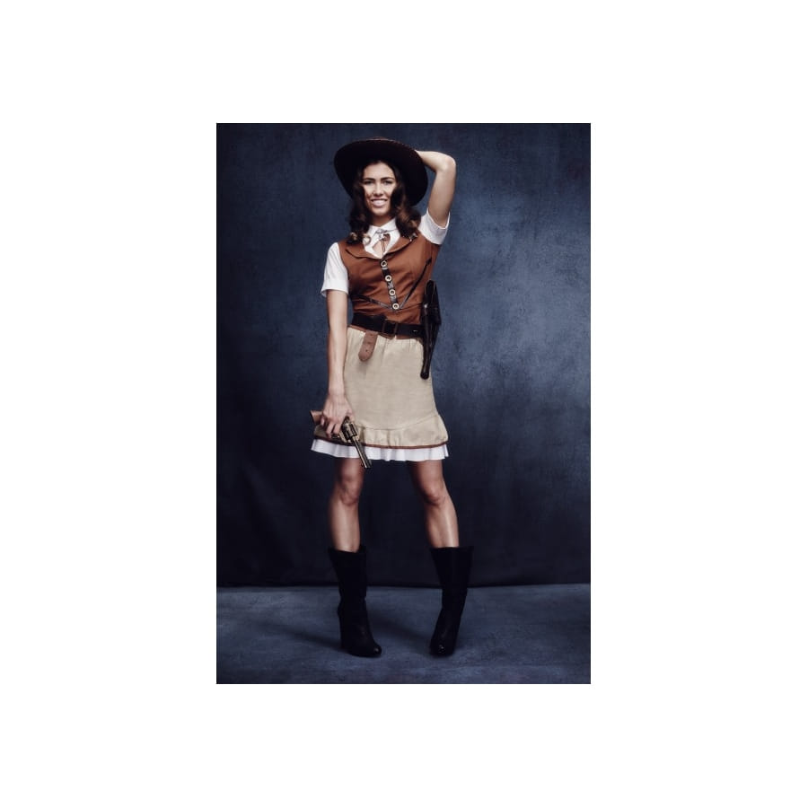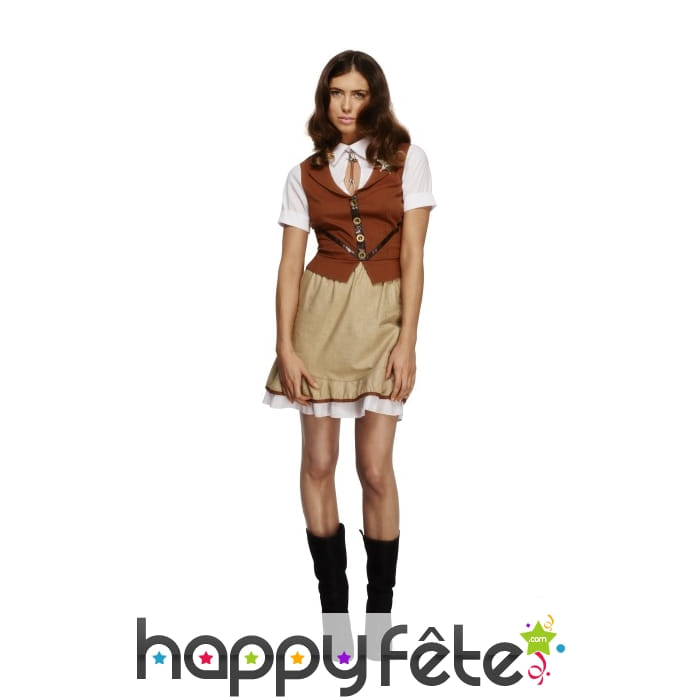 Si les femmes shérifs existaient au temps des cow boys, elles s'habilleraient sûrement comme sur cette photo, avec ce déguisement de femme shérif sexy que nous proposons ici. Un gilet de couleur marron avec une fausse chemise de couleur blanche à l'intérieur, une cravate d'un marron beaucoup plus clair, de la même couleur que la jupe, voilà les vêtements qui composent ce déguisement. Les tailles que nous proposons pour ce déguisement sont L, M et S. N'oubliez pas le chapeau de shérif et l'insigne, que vous pourrez trouver dans la section des accessoires de Happyfete.