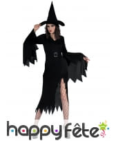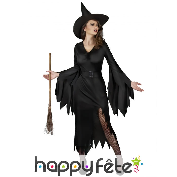 Plongeons tout de suite dans le vif du sujet, c'est-à-dire la pièce maîtresse de cette tenue : la robe. Imaginez une robe noire, moulante qui épousera vos formes tout en vous laissant libre de vos mouvements. Une robe fendue sur le côté gauche pour vous donner un côté à la fois mystérieux et audacieux. Et ce n'est pas tout, car le bas de la robe, ainsi que la fente, sont découpés en pointes pour suggérer un effet déchiré. Rajoutez à cela des manches souples et évasées, et vous avez la parfaite robe de sorcière, élégante et ensorcelante.