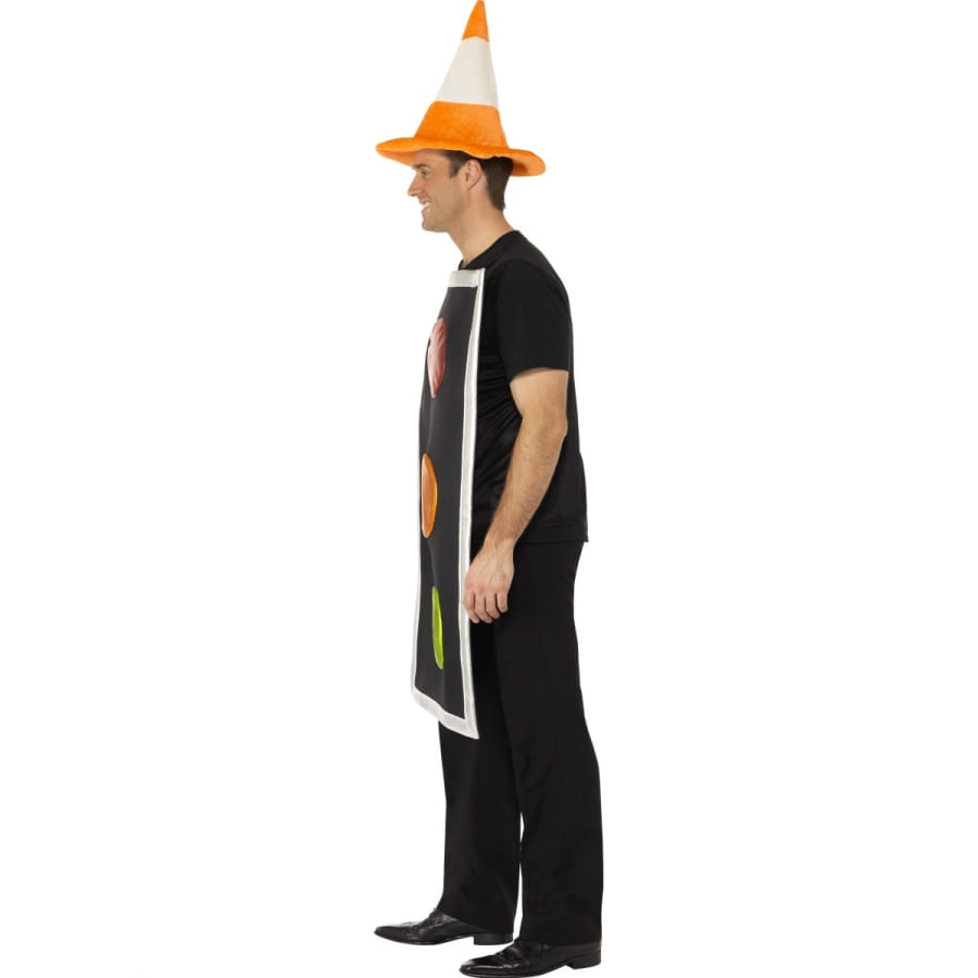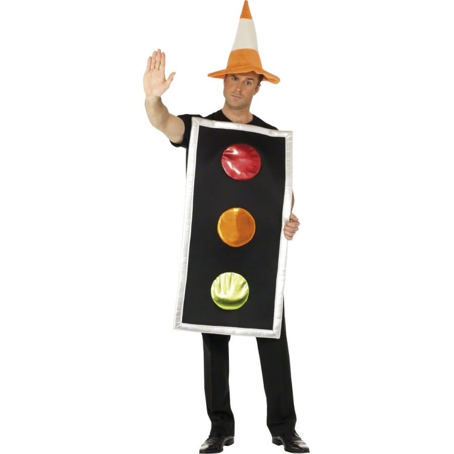 Costume de feu tricolore, pour homme ou adolescent, composé d'une tunique noire, rouge, orange et verte représentant les 3 feux et d'un chapeau en forme de cône de signalisation de couleur orange et blanche. Adoptez une tenue originale avec ce superbe déguisement!