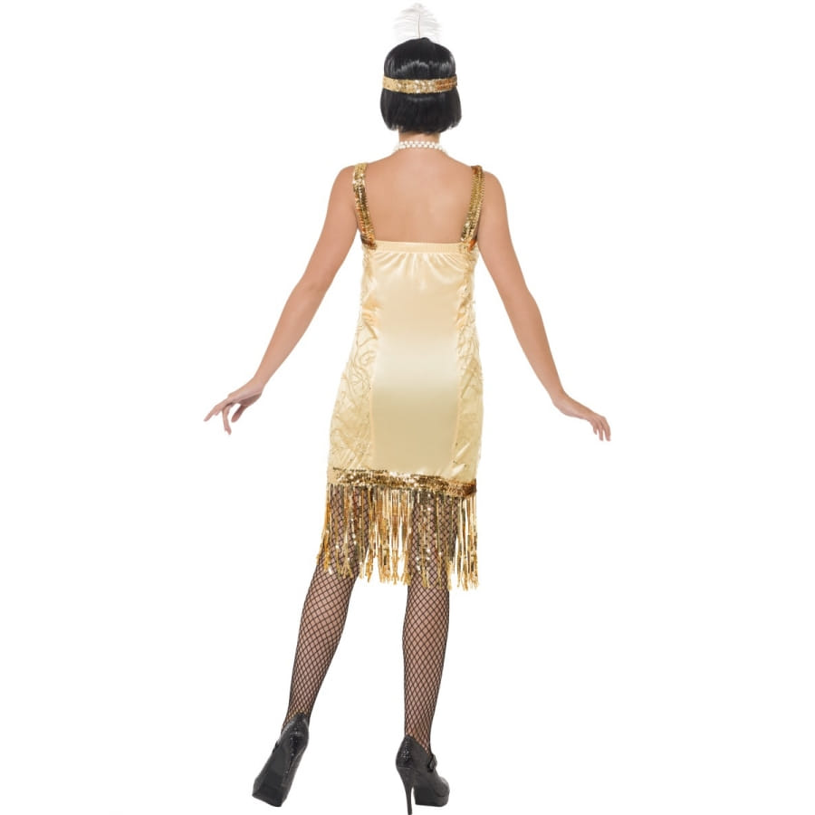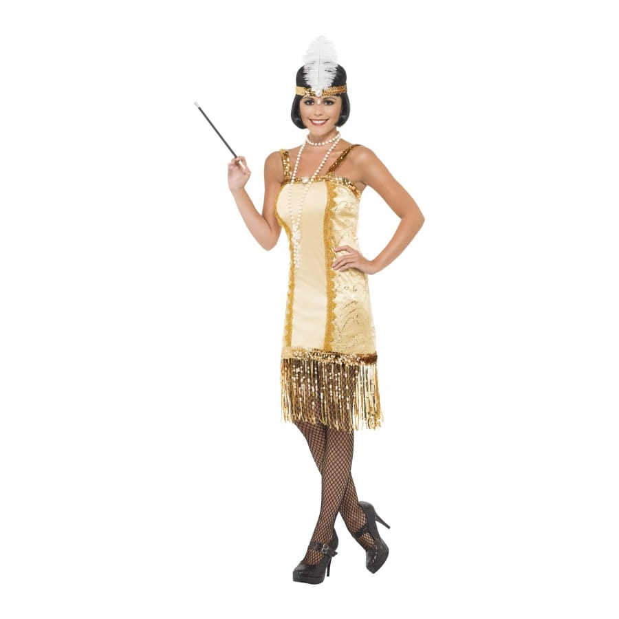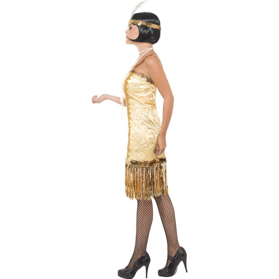 Déguisement Charleston, pour fille, composé d'une robe beige et d'une coiffe assortie. La robe est ornée de franges dorées avec des bretelles paillettés des ornements argentés. La coiffe est dorée et ornée d'une grande plume blanche. Le tout est disponible en taille S, M ou L au moment de votre commande. Cette robe est parfaite pour un style élégant et rétro, digne des années 20-30.