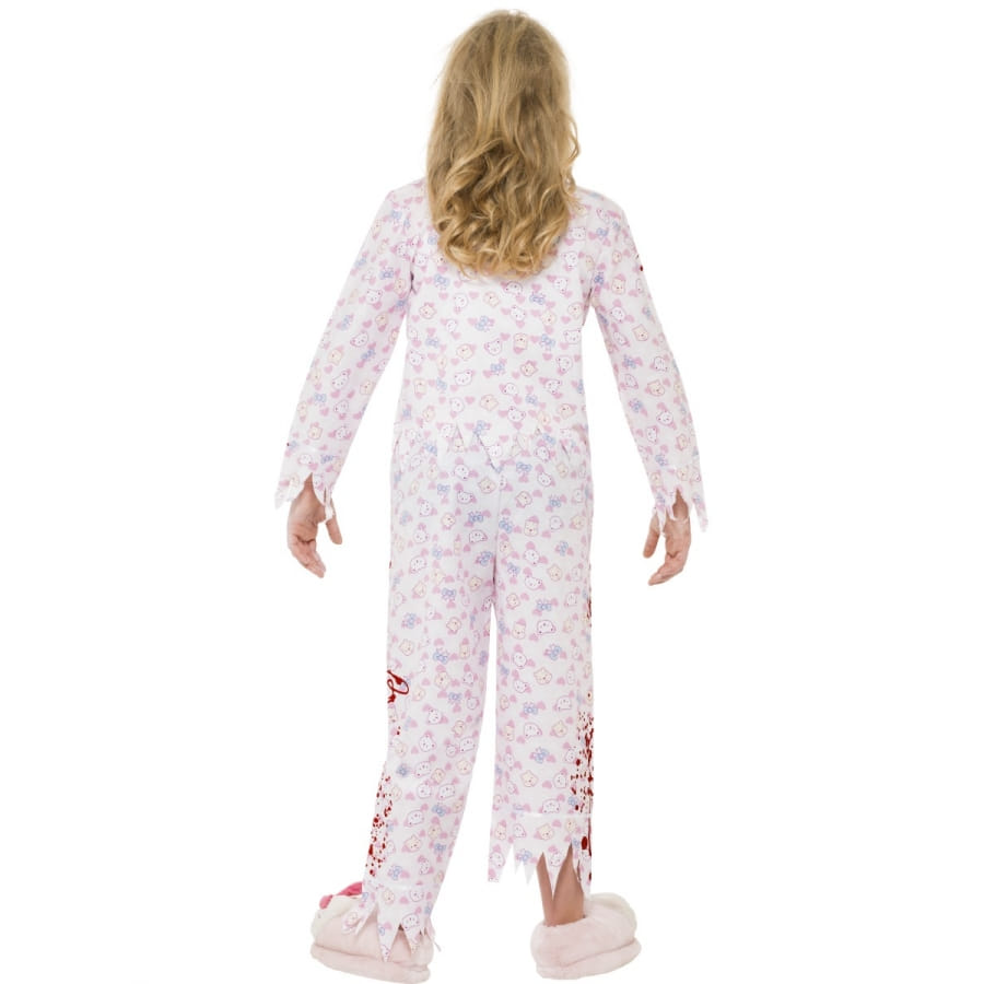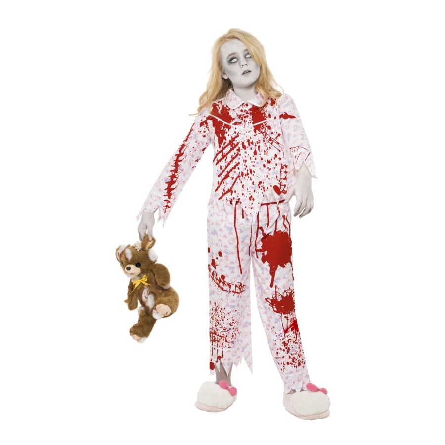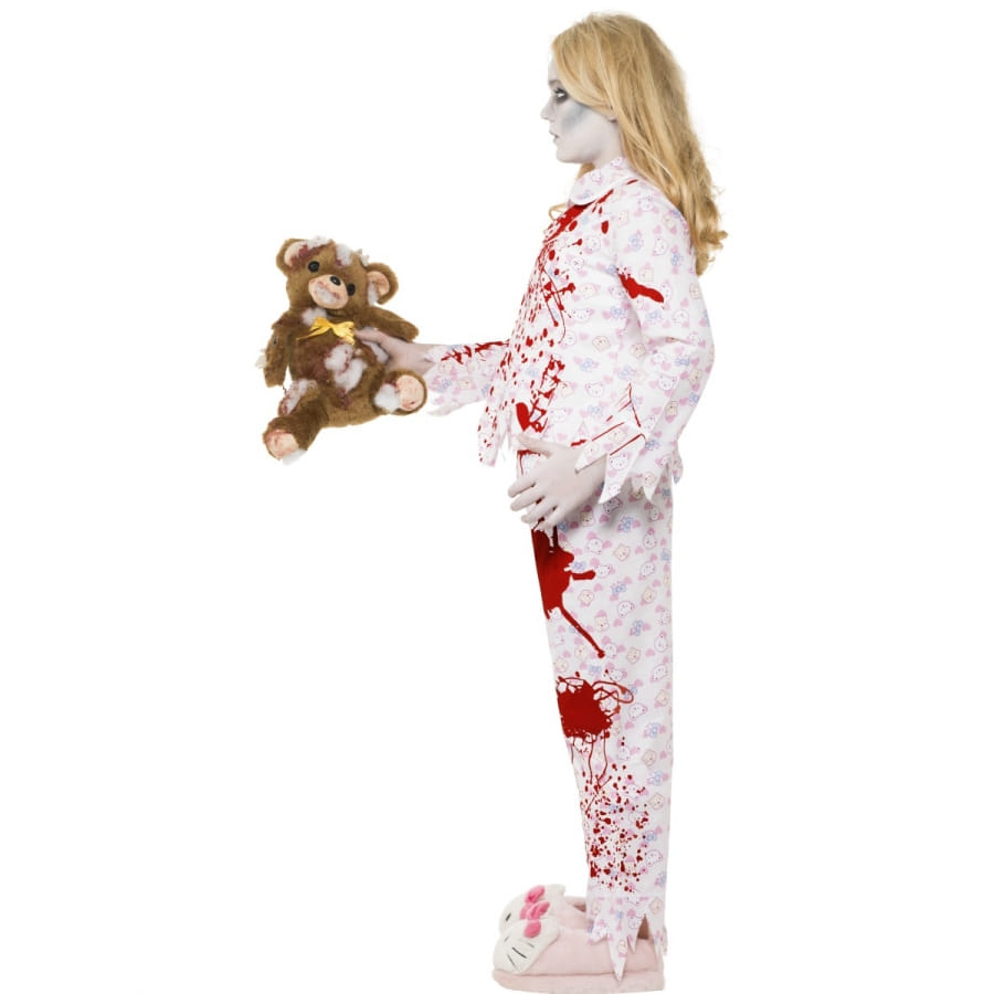 Pyjama de zombie pour fille composé d'un top à manches longues et d'un pantalon. Les deux accessoires sont de couleur blanche et tâchés de sang. Ils sont disponibles en taille M, L ou T. Avec cette tenue, votre enfant pourra se déguiser en zombie effrayant pour Halloween.