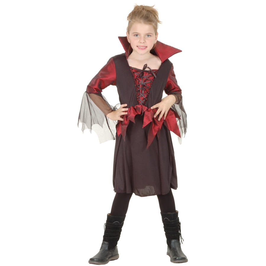 Si votre petite fille compte se transformer en une sorcière à l'occasion de la fête des morts, pourquoi ne pas lui offrir la tenue qu'elle mérite. En effet, nous vous proposons un déguisement fille vampire noir et bordeaux satiné. Il est formé d'une robe mi- longue de couleur noire, avec des détails rouges. La matière utilisée pour celle-ci s'avère assez légère et fluide, garantissant un meilleur confort. Elle est maintenue à la taille par une ceinture bouffante de couleur rouge. Cette dernière est faite de tissu satiné, également repris au niveau des manches et du corsage, ainsi que du col semi-rigide. Un voile très fin orne le bout de chaque manche. Un petit pendentif rouge accroché à un ruban noir complète l'ensemble de cette tenue.