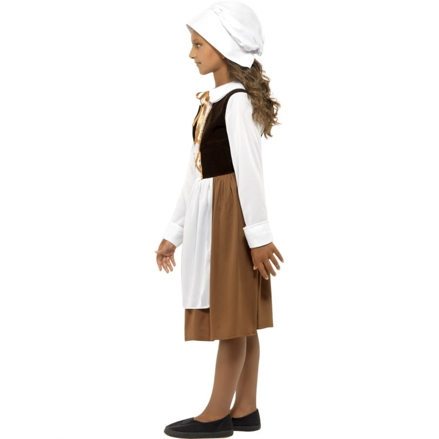 Nous ne cesserons jamais de vanter le mérite de la monarchie anglaise. Surtout de la dynastie Tudor qui a tant apporté au Royaume Uni. C'est à cet effet que nous avons conçu plusieurs déguisements Tudor, dont ce magnifique costume pour fillette. Il est formé d'une robe à col Claudine, avec des manches de chemise blanche, un faux gilet noir avec des lacets dorés et un tablier blanc, la jupe de la robe étant de couleur marron. La coiffe de couleur blanche est également assortie à la robe. Votre petite fille sera ravie de découvrir une culture extraordinaire qu'est celle des Anglais en portant ce joli costume. Il est idéal pour les carnavals ou pour les fêtes où un beau déguisement est de mise. Il est disponible sous les tailles S(4-6 ans), M(7-9 ans) et L(10-12 ans). A nettoyer à sec uniquement.