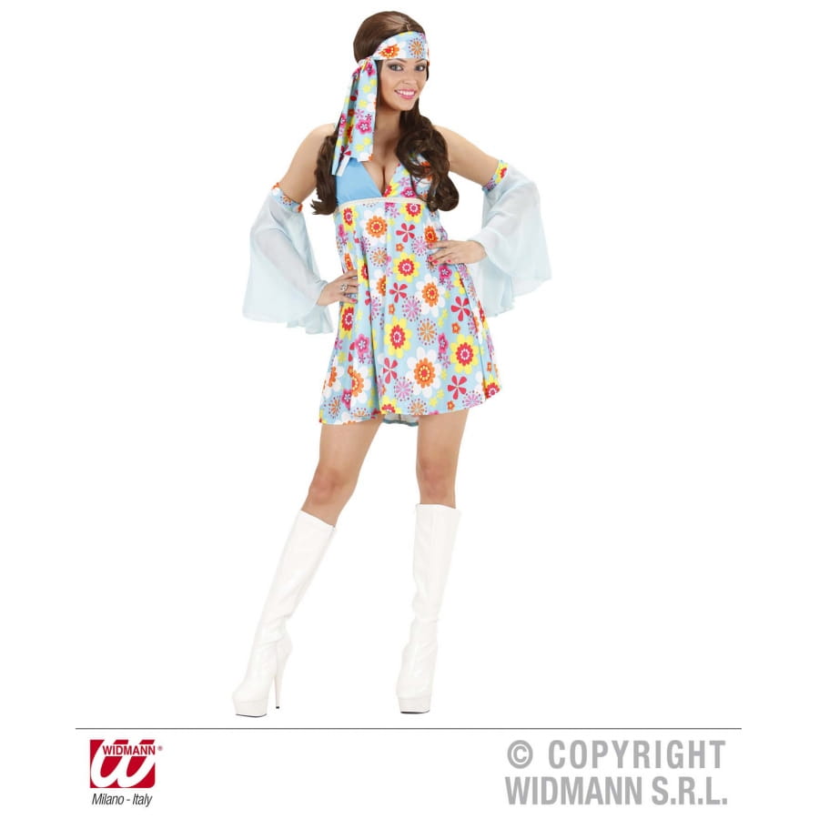 Déguisement Flower Power Girl, pour femme ou adolescente, composé d'une robe, d'un serre-tête et de bandeaux avec voile pour les bras, tous à fleurs multicolores. Déguisez-vous en ravissante baba cool pour une soirée hippie!