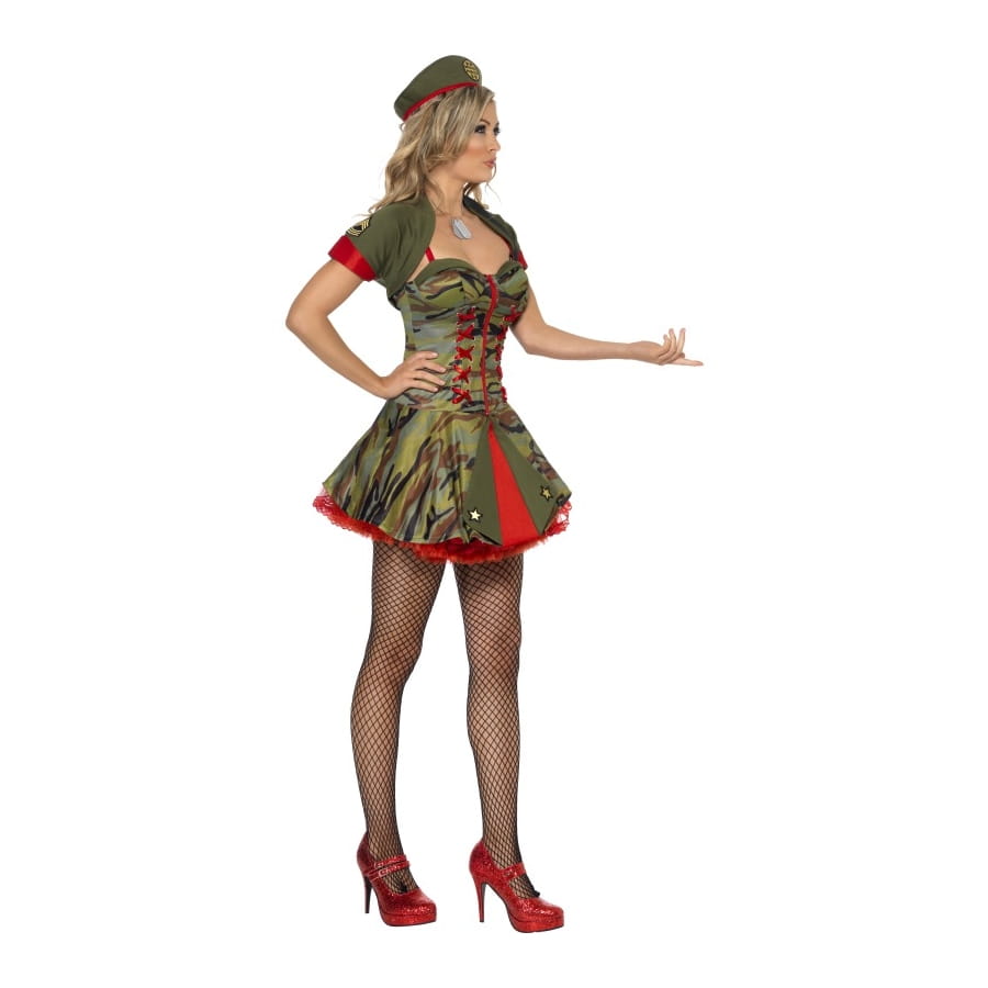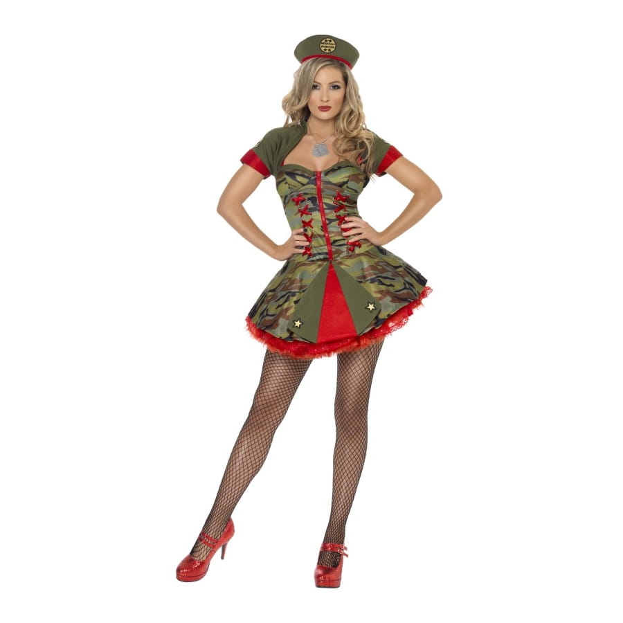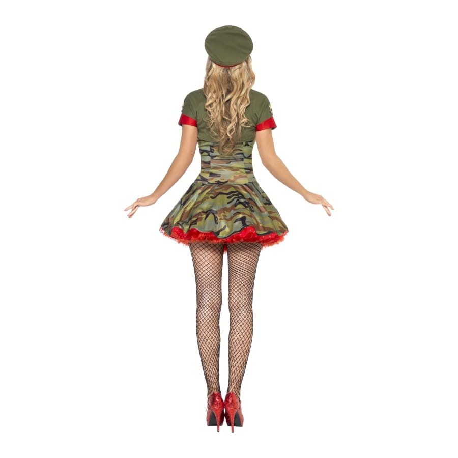 Déguisement de force spéciale sexy, pour femme, composé d'une robe avec corset, d'épaulières et d'un chapeau. Ces trois accessoires sont de couleur rouge et kaki avec des motifs militaires. La robe est en forme de tutu avec des dessous rouges. Elle est disponible en taille S, M ou L. Enfilez-la et la gent masculine se pliera à vos ordres!