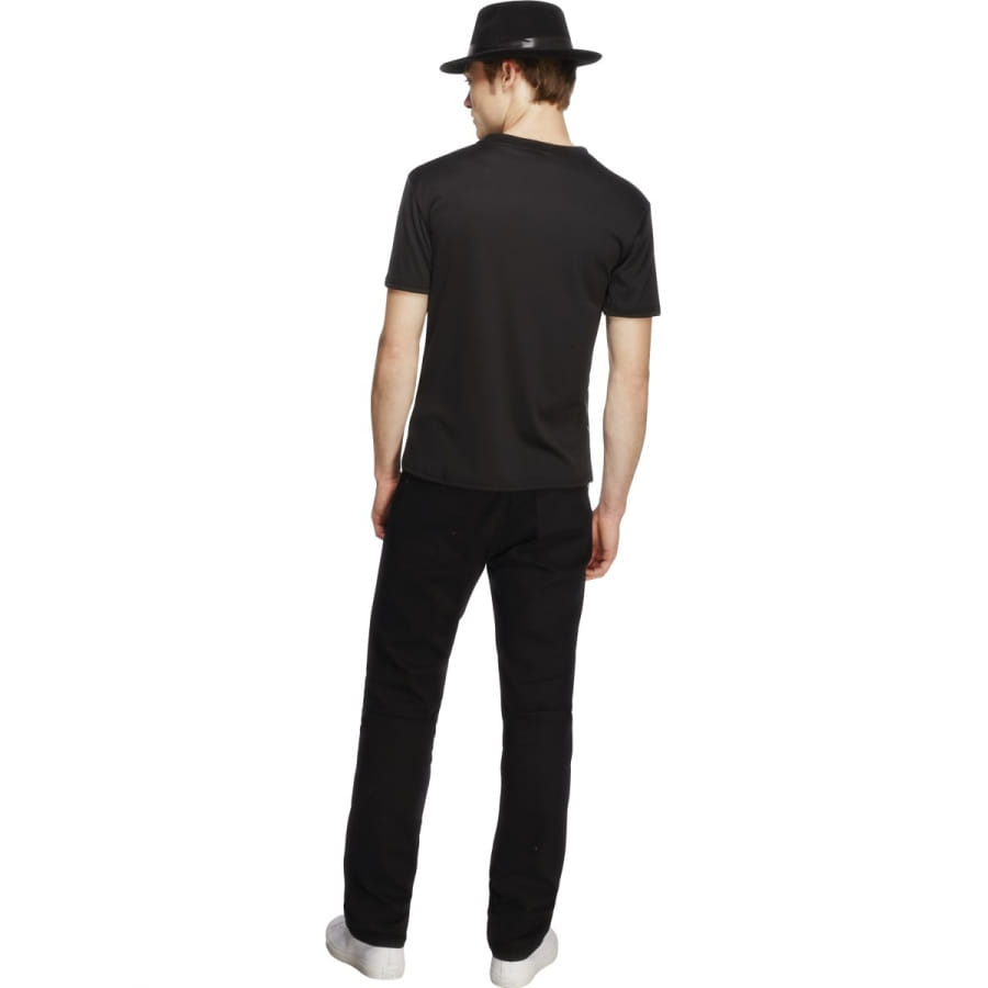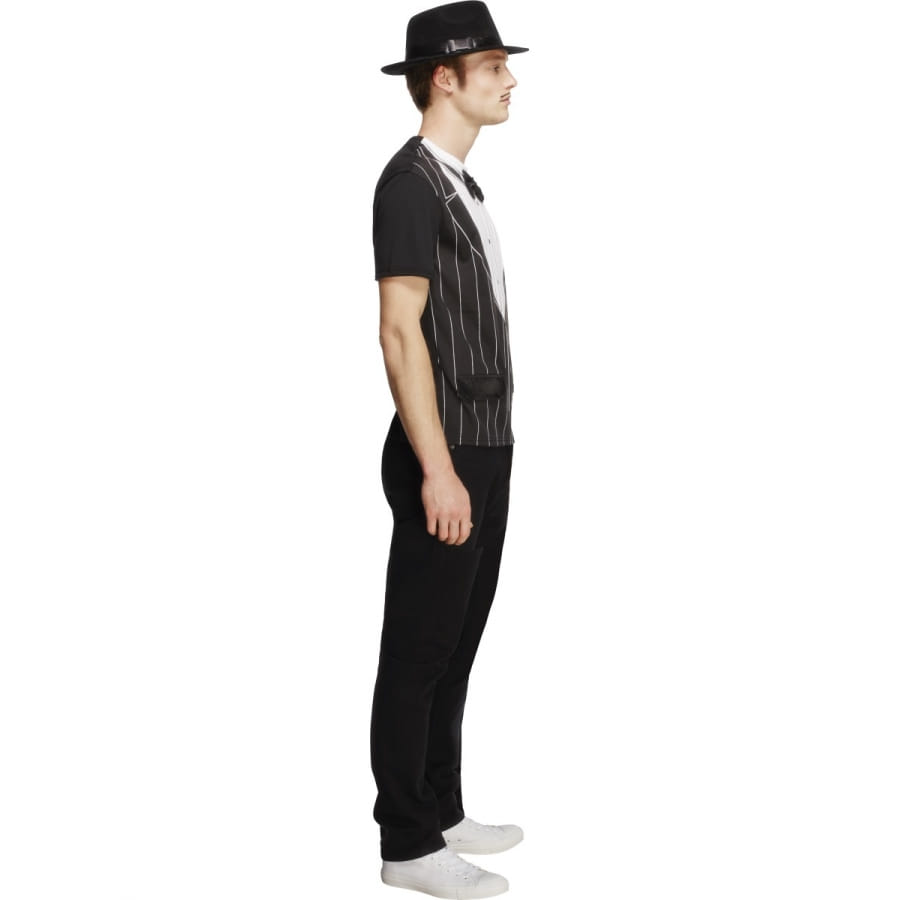 Déguisement de gangster, pour homme, composé d'un t-shirt imprimé pour ressembler à un gilet sur une chemise. Le gilet est noir à fines rayures blanches et la chemise est blanche à fines rayures noires. Un noeud papillon a également été imprimé. Enfilez ce t-shirt pour un style de gangster moderne et nonchalant.