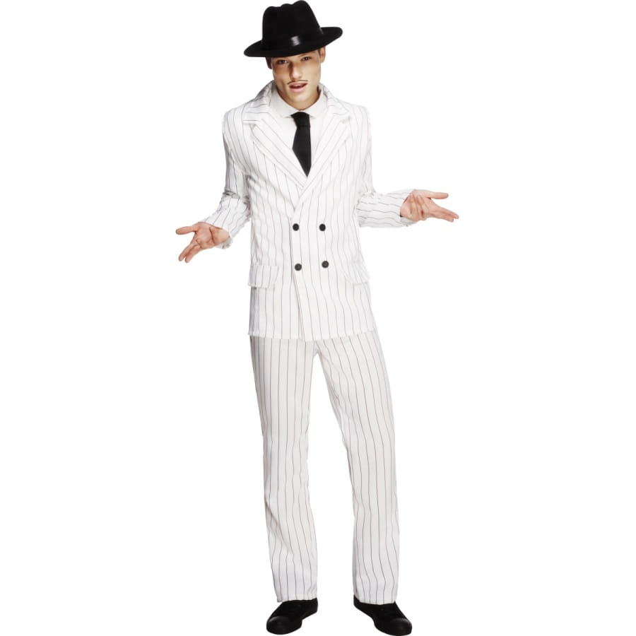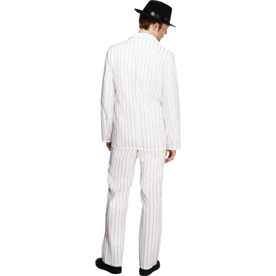 Un costume de gangster qui est de couleur blanc rayé noir. Il est composé d'une veste ainsi que d'un pantalon de taille L. Vous pourrez porter ce costume pour un thème comme mafia ou encore pour incarner un gangster ou encore un séducteur. Ce déguisement est de taille L.