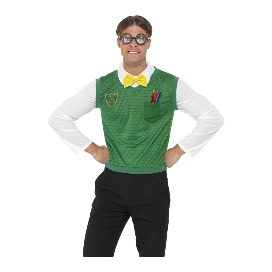 Ce costume de geek parfait pour le carnaval, vous pourrez incarner un geek dans ce déguisement. Il est composé d'une paire de lunette de couleur noir, d'un nœud papillon jaune et d'un top vert avec poche sur le devant.