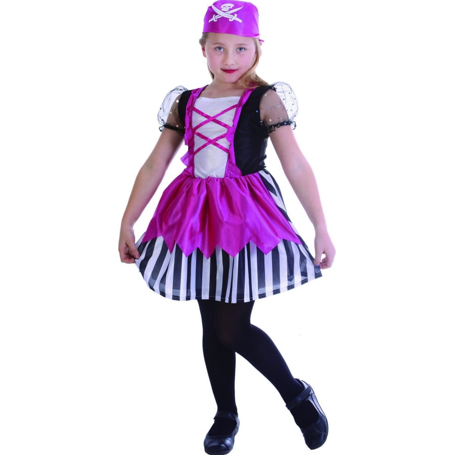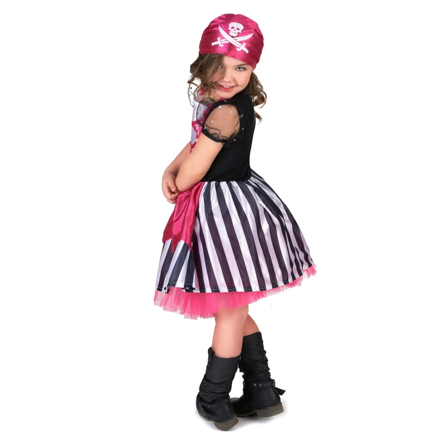 Le déguisement girly rose de pirate pour fillette comporte une robe combinant harmonieusement les couleurs noir, rose et blanc.