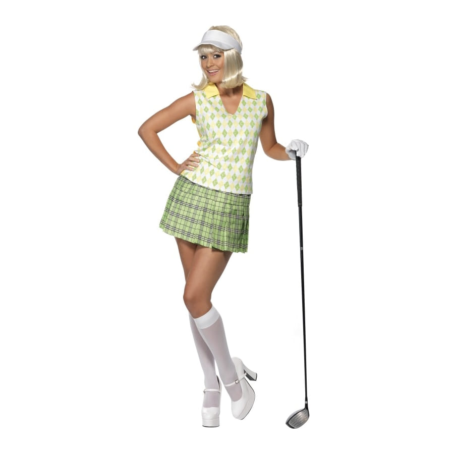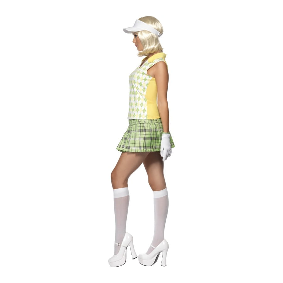 Déguisement de golfeuse sexy, pour femme adulte, composé d'une casquette blanche, d'un top vert et jaune, d'une jupe à carreaux verts et d'un gant blanc. Vous pourrez choisir entre une taille S, M ou L au moment de votre commande. Elle fera de vous une golfeuse BCBG sexy.