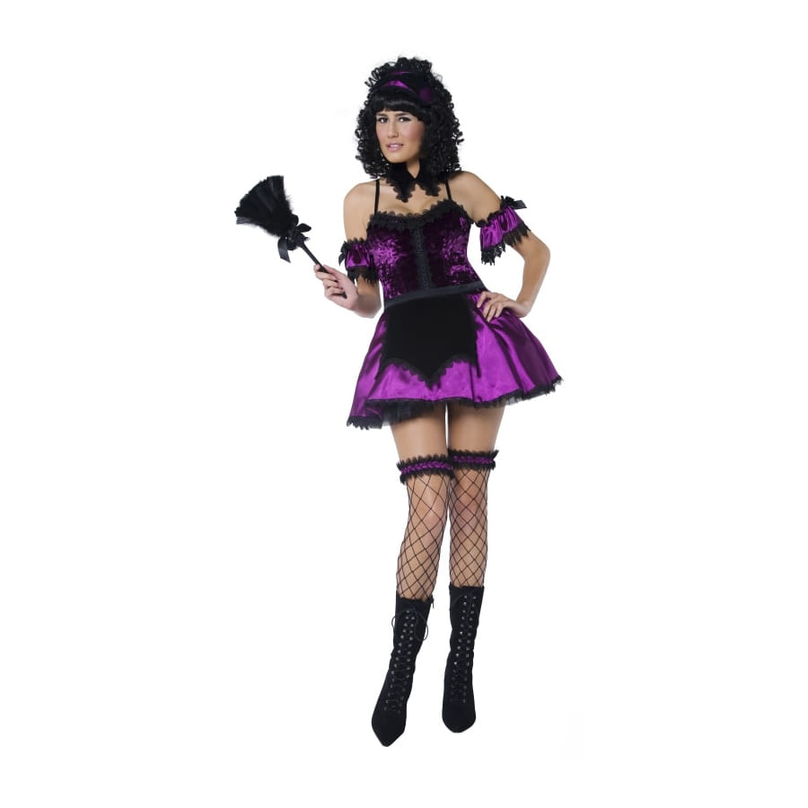 Déguisement de gouvernante sexy noir et violet, pour femme, composé d'une robe, d'un tablier, de bracelets pour les bras, d'un serre-tête et de jarretelles. Ce déguisement sera idéal pour la Saint Valentin; il fera plaisir à votre partenaire!