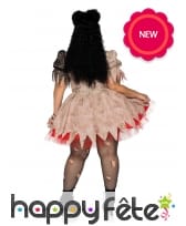 Ce déguisement inclut une robe, un bracelet et un tour de cou. La robe beige et mi-longue possède un superbe décolleté plongeant. Elle est agrémentée d'un faux laçage rouge et d'empiècements rouges, ainsi que de motifs en forme de symboles vaudou.
