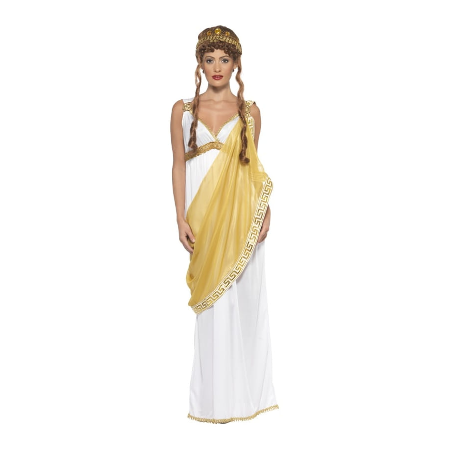 Vous pourrez incarner une princesse, une reine et même une déesse dans ce déguisement d’Hélène de Troie. Il est composé d'une magnifique longue robe blanche et dorée avec un décolleté plongeant sans manche. Ce déguisement de taille L est aussi composé d'une couronne dorée.