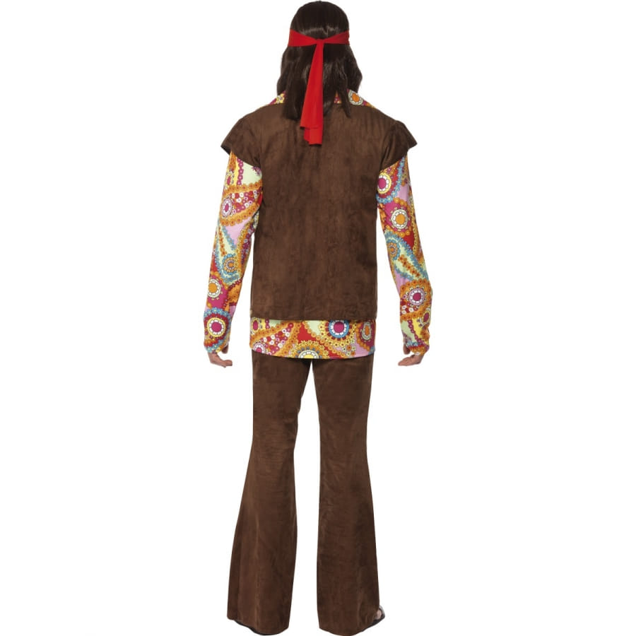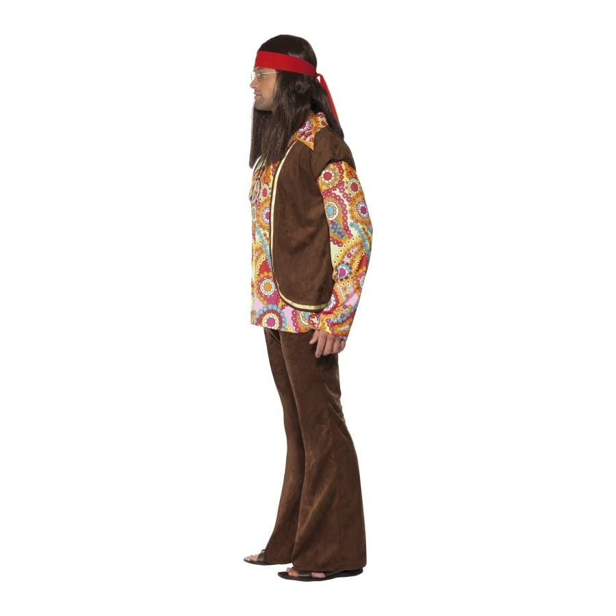Déguisement de hippie, pour homme, composé d'un pantalon marron, d'une chemise multicolore et d'un gilet marron. La chemise est imprimée de fleurs psychédéliques multicolores et le gilet contient une fine bordure dorée. Vous pourrez choisir entre une taille S, M ou L lors de votre commande. Cette tenue sera idéale pour une fête hippie basée sur le thème des années 50-60.
