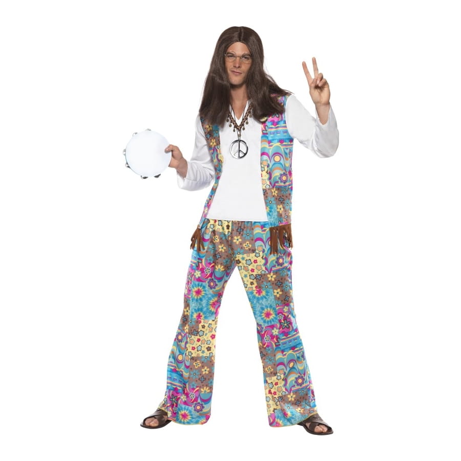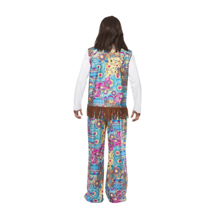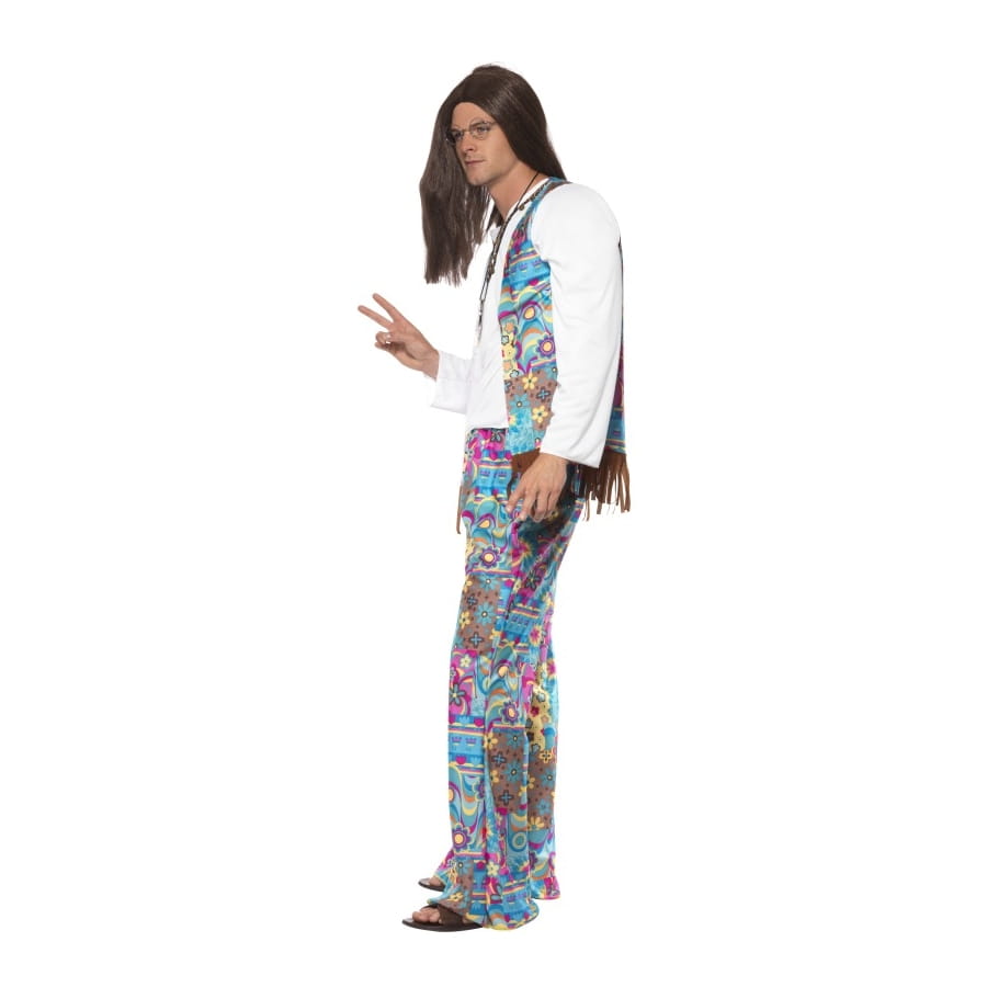 Déguisement de hippie, pour homme, composé d'une chemise blanche avec gilet attaché, d'un pantalon et d'un bandeau. Le gilet et le pantalon sont imprimés de motifs fleuris multicolores. L'ensemble est disponible en taille S, M ou L. Enfilez ce déguisement et vous serez prêt pour votre fête hippie.