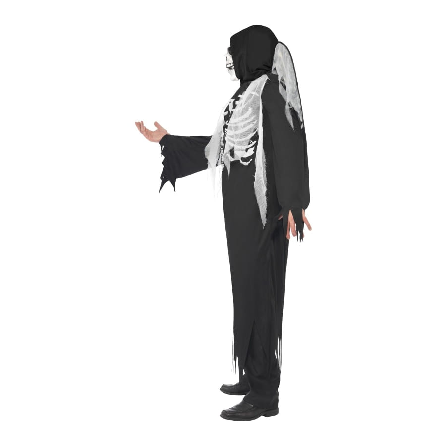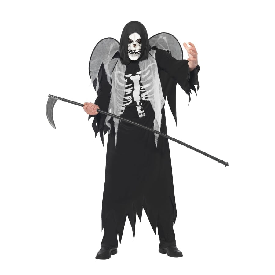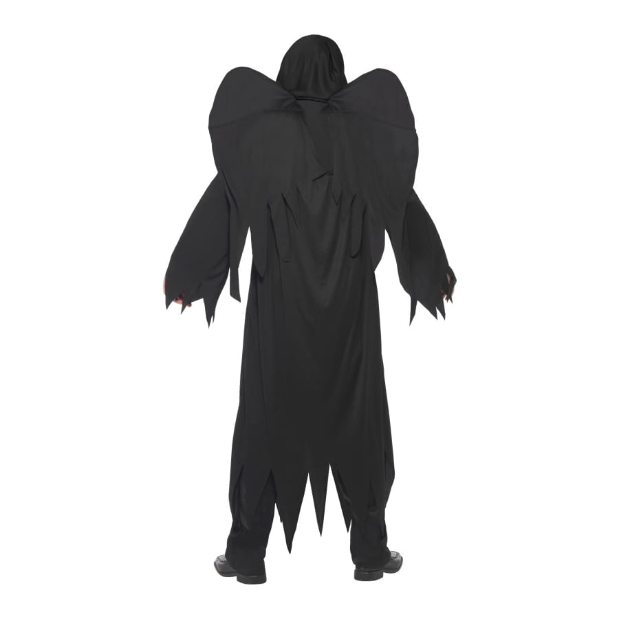 Déguisement d'ange de la Mort, pour homme, composé d'une robe noire avec capuchon, d'un masqe squelette noir et blanc et d'une paire d'ailes grises. Cet ensemble fera de vous l'ange que tout le monde redoutera lors de la nuit d'Halloween. Il est disponible en taille S, M ou L.