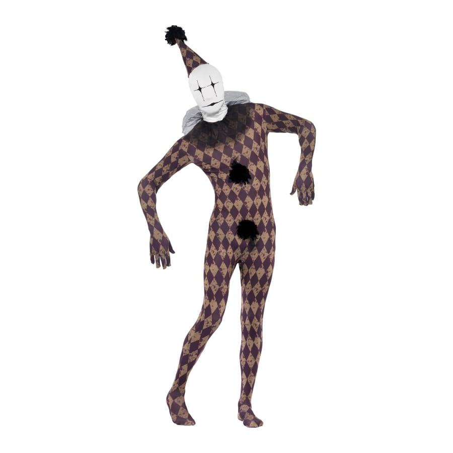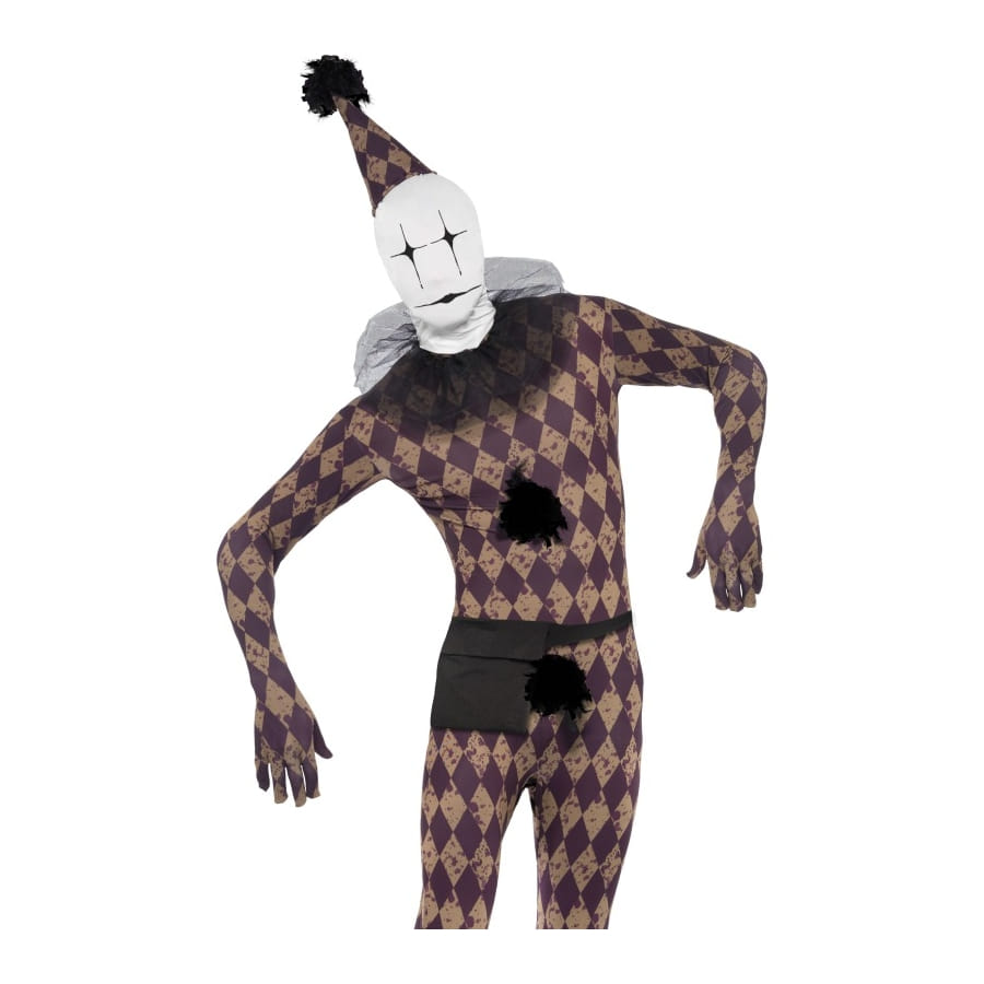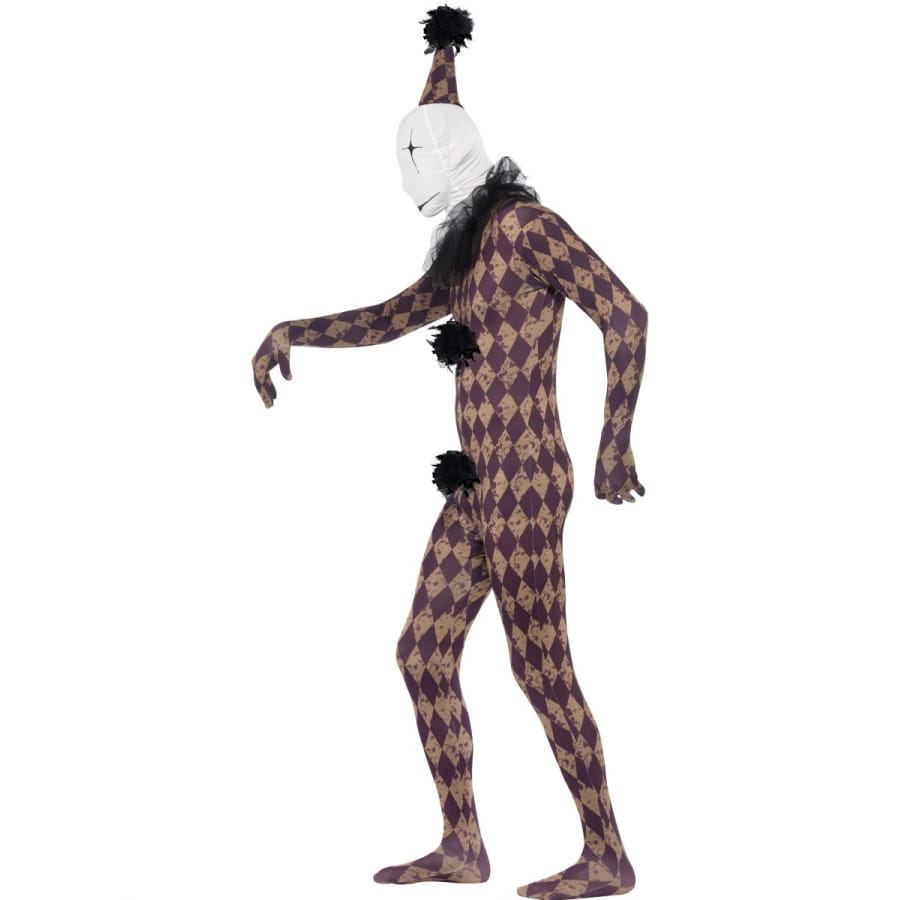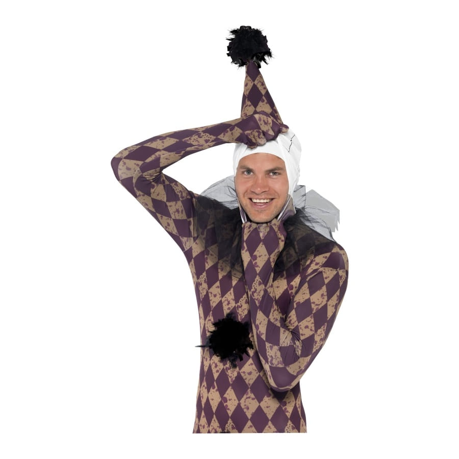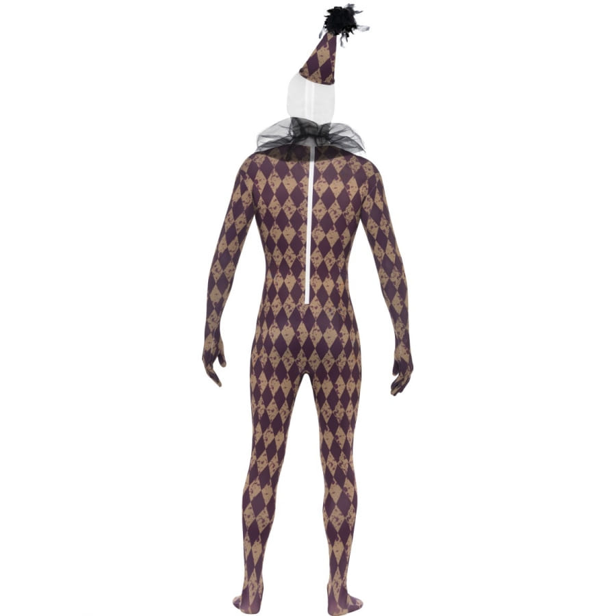 Déguisement d'arlequin, pour homme, composé d'une combinaison et d'un chapeau. Ils sont tous deux ornés de pompoms noirs et imprimés de motifs en diamants marrons. Ils sont disponibles en taille M, L ou XL. C'est un déguisement idéal pour une fête médiévale ou basée sur un thème humoristique.