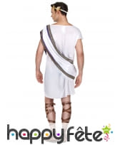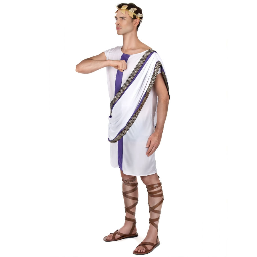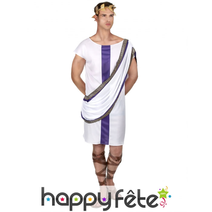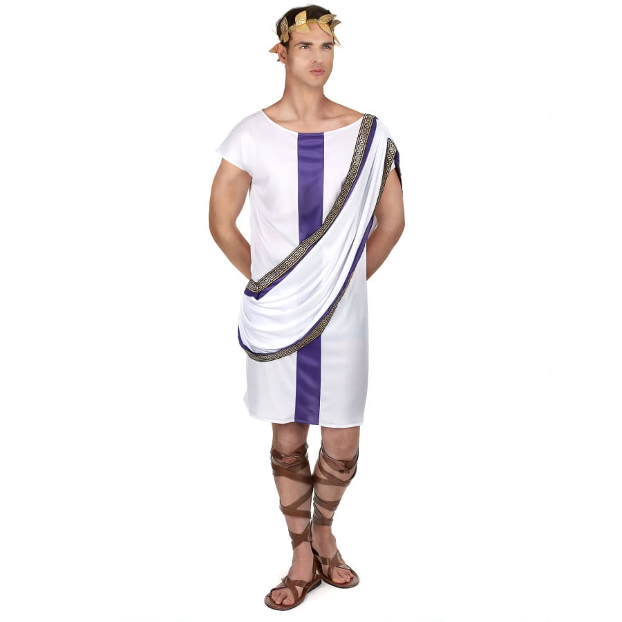 Commencez par la tunique. Ah, cette tunique blanche éclatante, que tout empereur se devrait de porter. Elle arbore fièrement une bande satinée violette, la couleur des empereurs, au centre. Et pour ajouter une touche d'éclat supplémentaire, la tunique est joliment agrémentée d'un drapé orné d'un galon doré, rappelant le luxe et le raffinement de la Rome antique.