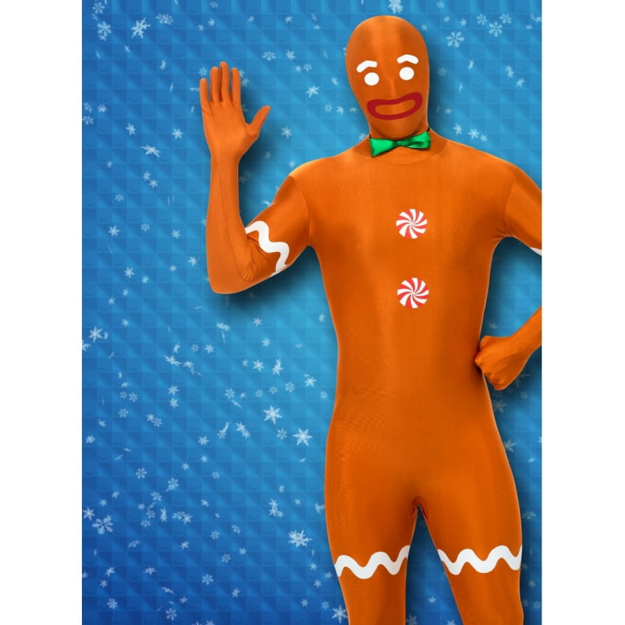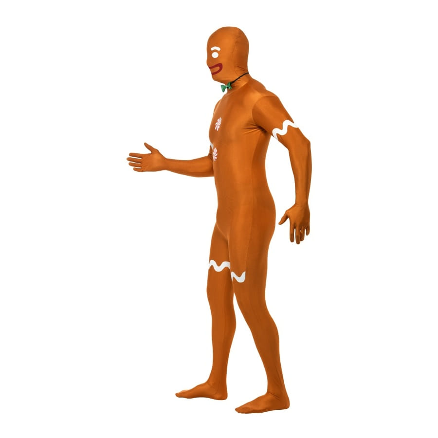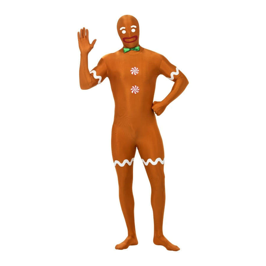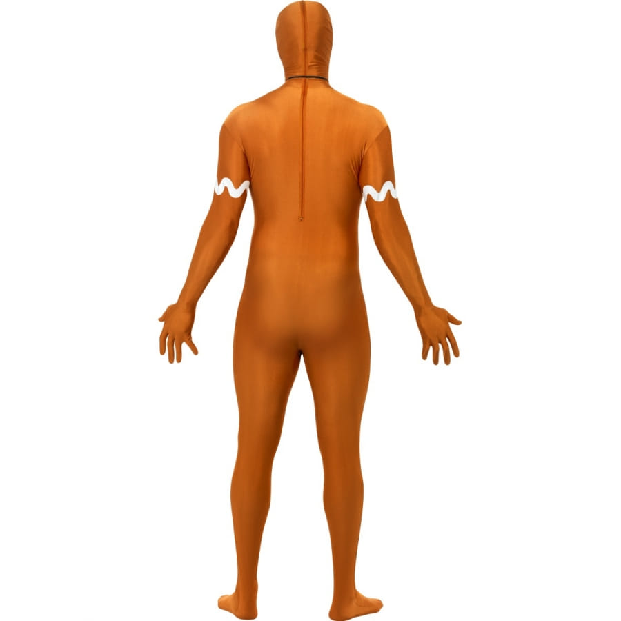 Déguisement d'homme gingembre, pour homme, composé d'une combinaison moulante à effet seconde peau de couleur marron, noire et verte. La combinaison est disponible en M, L ou XL au moment de la commande. Elle sera idéale pour une fête basée sur les contes de fées.