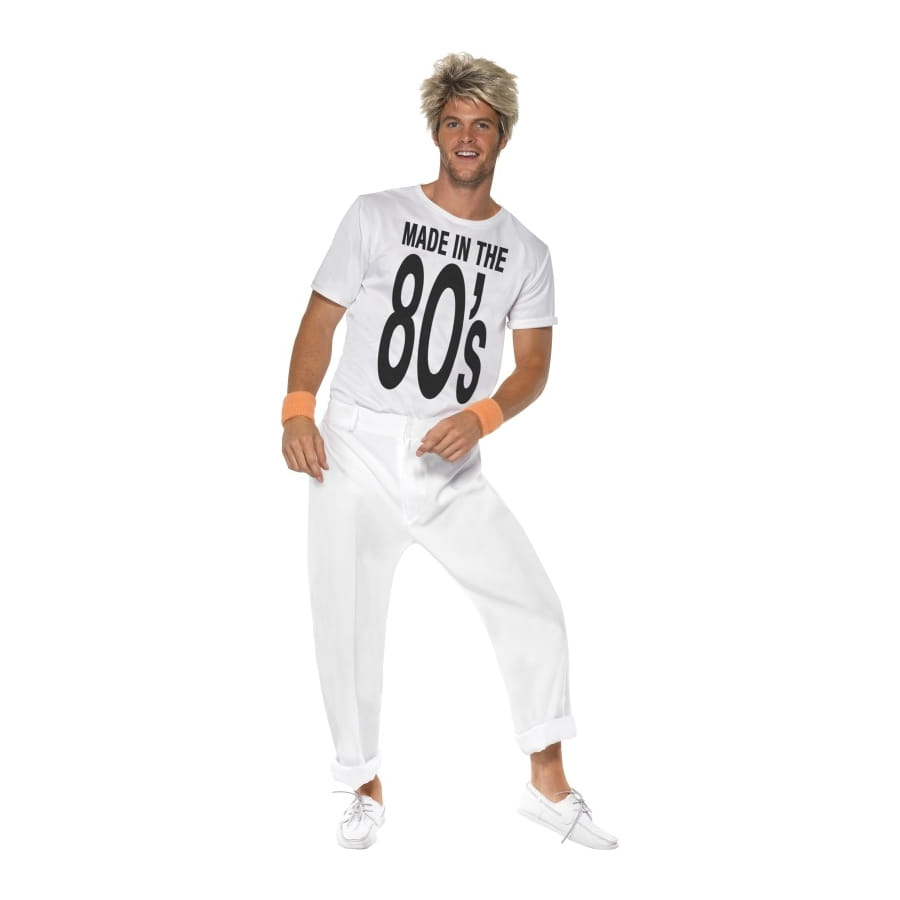 Déguisement "Made in the 80's", pour homme, composé d'un top et d'un pantalon blancs. Le top est imprimé du texte "Made in the 80's" en noir. Ils sont tous deux disponibles en taille M, L ou XL au moment de la commande. Vous pourrez les utiliser pour un personnage Rock'n Roll.