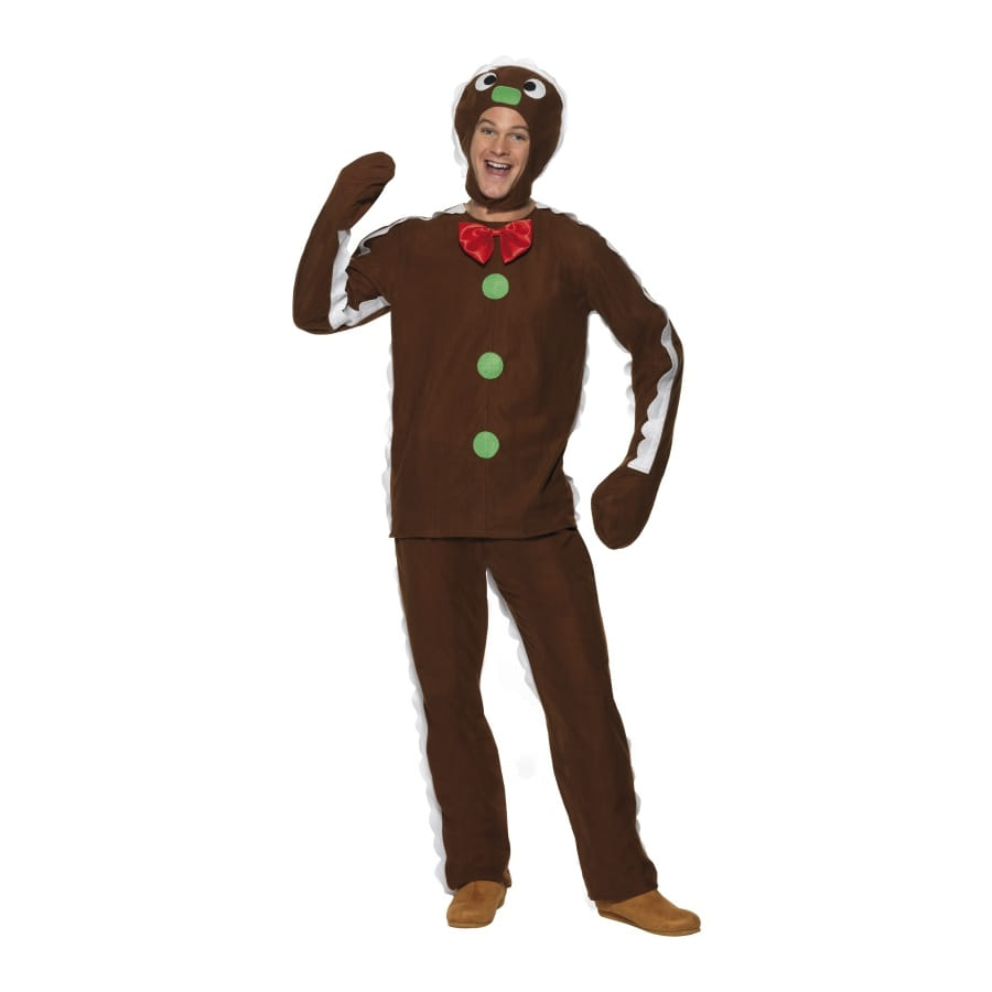 Déguisement de petit homme en pain d'épices, pour homme, composé d'un pantalon, d'un top et d'un chapeau marrons, avec des yeux, un nez et des boutons verts. C'est un déguisement drôle qui égaiera l'atmosphère de Noël. Il est disponible en taille S, M ou L.